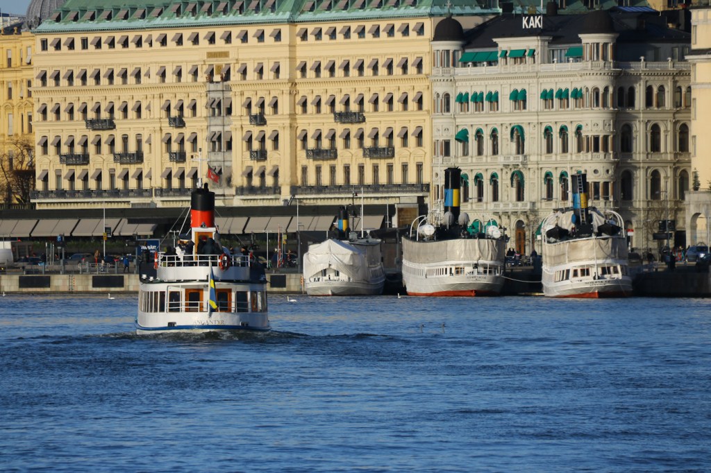 Vackra akterpartier på fyra klassiska fartyg. Strömma Kanalbolagets m/s Angantyr från 1909, sedan Waxholmsbolagets m/s Västan från 1900, s/s Storskär från 1908 och s/s Norrskär från 1910. Angantyr sköter sightseeingtrafiken under vintermånaderna när Delfinbåtarna ligger i vintervila. Grand Hotells sedan några år tillbaka upputsade fasad är ju också något att nämna här. Denna bild togs från en tur till Vaxholm den 27 januari.