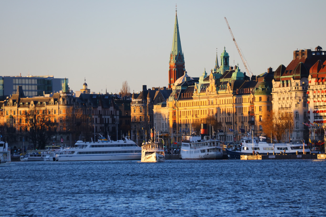 Vackra akterpartier på fyra klassiska fartyg. Strömma Kanalbolagets m/s Angantyr från 1909, sedan Waxholmsbolagets m/s Västan från 1900, s/s Storskär från 1908 och s/s Norrskär från 1910. Angantyr sköter sightseeingtrafiken under vintermånaderna när Delfinbåtarna ligger i vintervila. Grand Hotells sedan några år tillbaka upputsade fasad är ju också något att nämna här. Denna bild togs från en tur till Vaxholm den 27 januari.