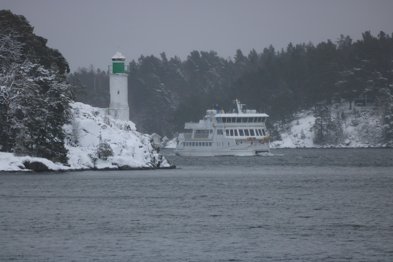 Grått och åter grått när det blev en resa ut till Husarö den 5 januari. Från Boda på Värmdö blev det båten Söderarm som på bilden strax ska lägga till just vid den bryggan. Fyren på ön till vänster i bild står på Kalvön, således är det alltså Kalvö fyr. Denna fyr ligger längs en av stora farlederna till/från Stockholm.