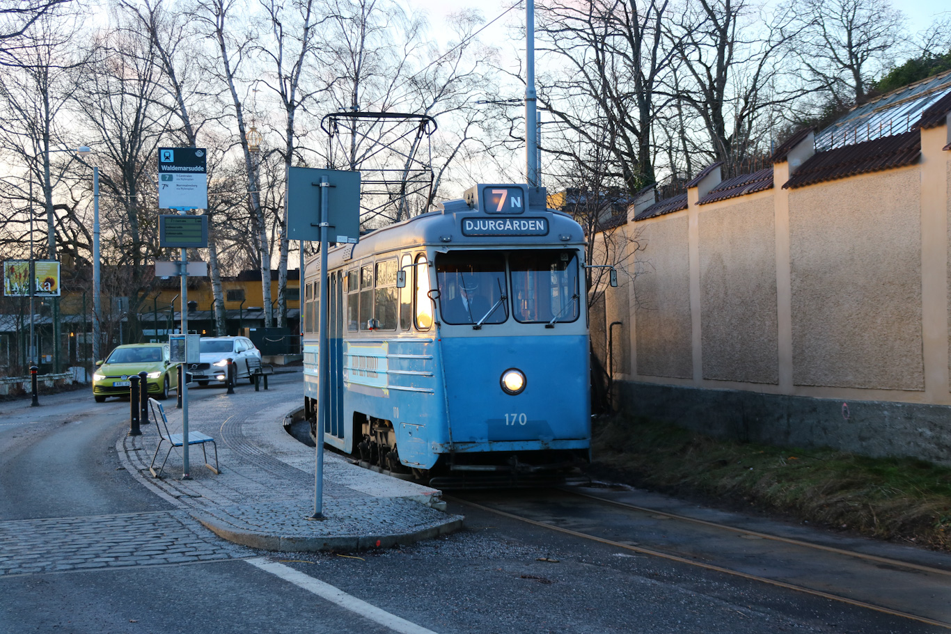 När de spanska spårvagnarna på spårvägen ut till Djurgården trilskas så får de gamla rycka ut. Här A29 170 vid Waldemarsudde den 16 januari. Denna vagn stod under många år i Spårvägsmuseet på Södermalm, men sedan 7-8 år tillbaka är den i trafik för museispårvägen Djurgårdslinjen. Och Spårvägsmuseet förresten, ja det kan ni besöka i Hjorthagen numera.