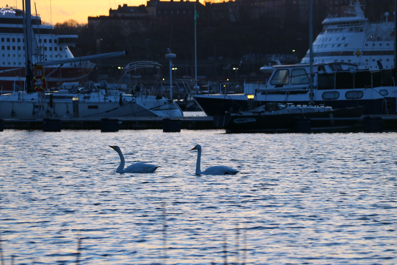 Sångsvanar brukar vara vanligt förekommande i centrala Stockholm under vintern.
