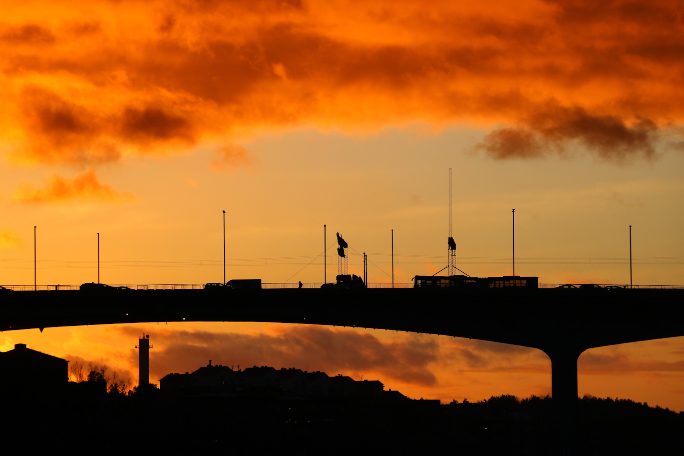 Uppe på motorvägen kan man inte njuta lika fullt ut av den begynnande skymningen. Bredvid motorvägen finns spårvägen Tvärbanans förbindelse mellan Gröndal och Stora Essingen. Tvärbanan som har linje 30 numera och som utgår i sydost vid Sickla station och har sin slutstation i andra änden vid Solna station. Sedan finns numera också en avstickare som utgår från Alviks strand och går till Bromma flygplats, vilken utgör linje 31.