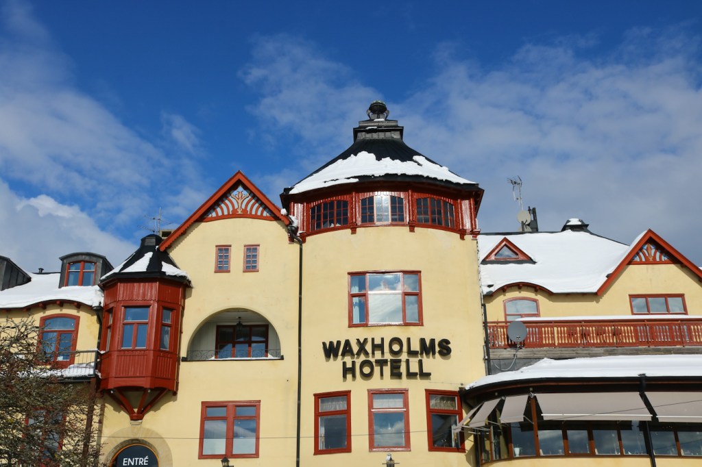 Waxholms hotell, byggd i jugendstil i början av 1900-talet. Erik Lallerstedt hette arkitekten bakom denna pampiga byggnad, farfar till krögaren och kocken med samma namn och som hade restaurangen Gondolen vid Slussen under ganska många år. Matsalen till höger nedkant har en härlig vy över Söderhamnen och sundet mot Kastellet.
