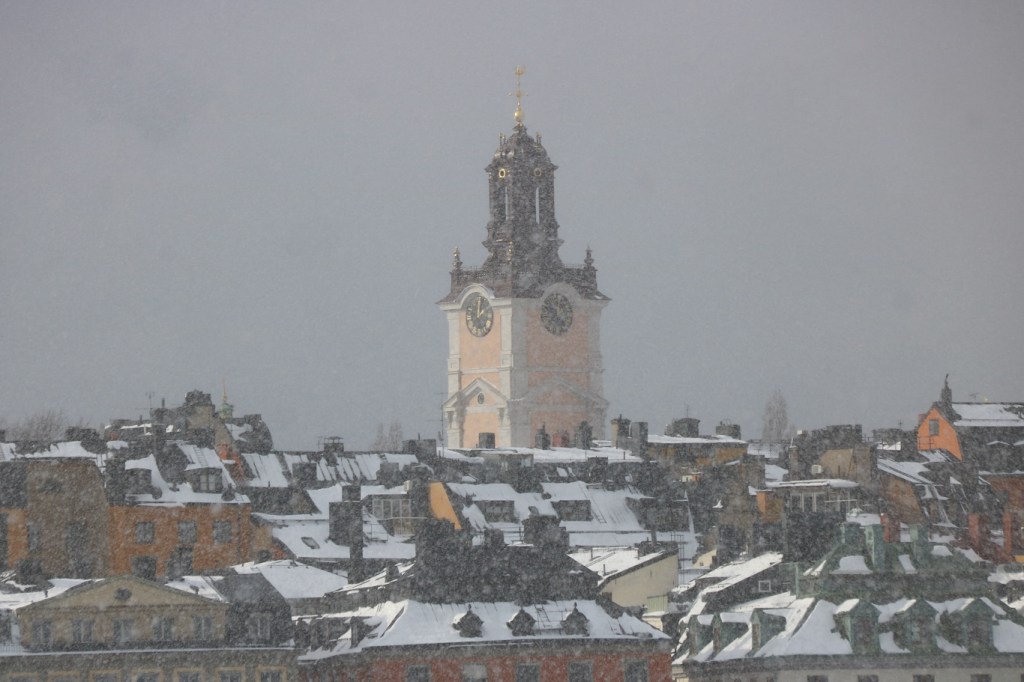 Ännu ett kyrktorn i snöyra fast uppe på Söders höjder – Katarina kyrka.