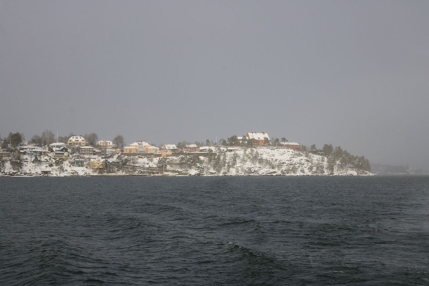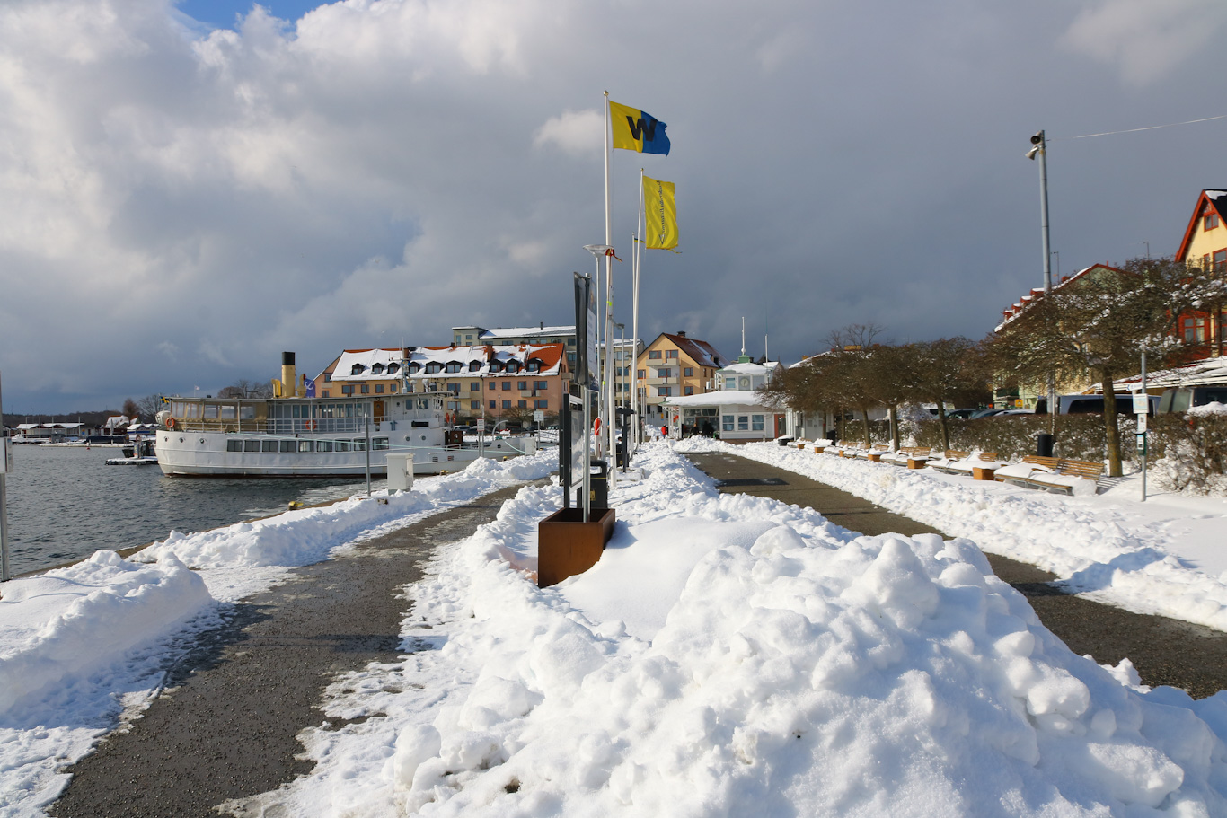 Snörikt på kajen i Vaxholm efter föregående veckas nederbörd. Båten som ligger inne vid kaj är m/s Riddarfjärden, en från början Göteborgsbåt, och som fått rycka in i skärgårdstrafiken nu när ett par isgående tonnage tvingats till stillaliggande på grund av olika anledningar.