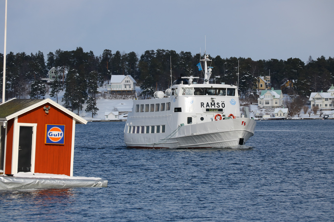 M/S Ramsö kom från Ljusterö på en tur där hon fått ersätta m/s Sandhamn. Så trots SL-loggorna påmålade på bryggfronten så var det en av Waxholmsbolagets turer hon var i trafik på under detta tillfälle.
