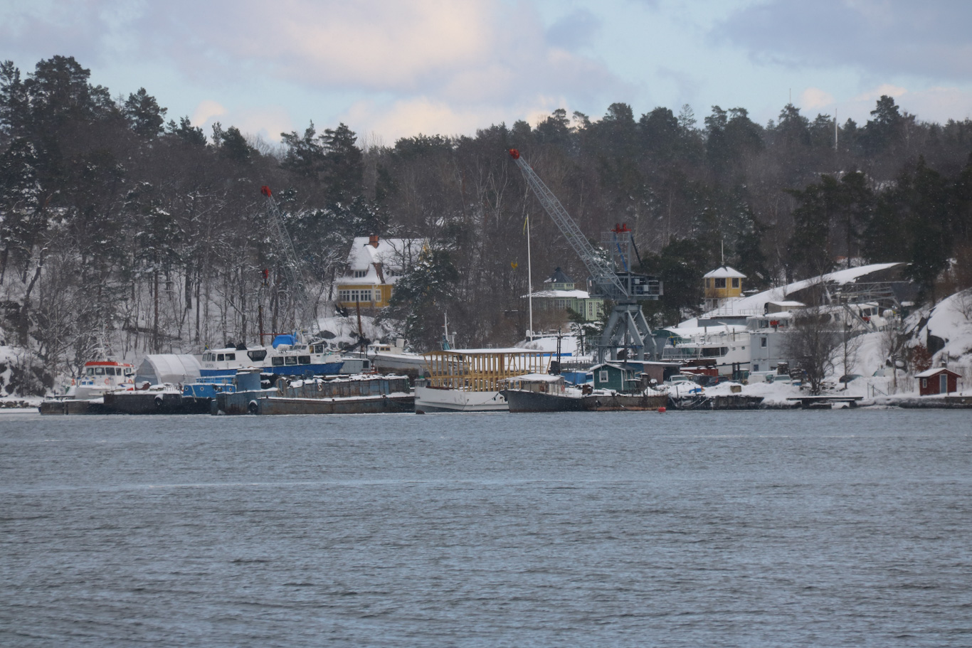 Mellan Gåshaga och Hasseludden så kan man inne i Kummelnäsviken skymta Kummelnäs varv. Ett av de varven som används för service eller renovering av skärgårdsbåtar. På bilden syntes vid tillfället bland annat m/s Sjögull uppe på slipen.