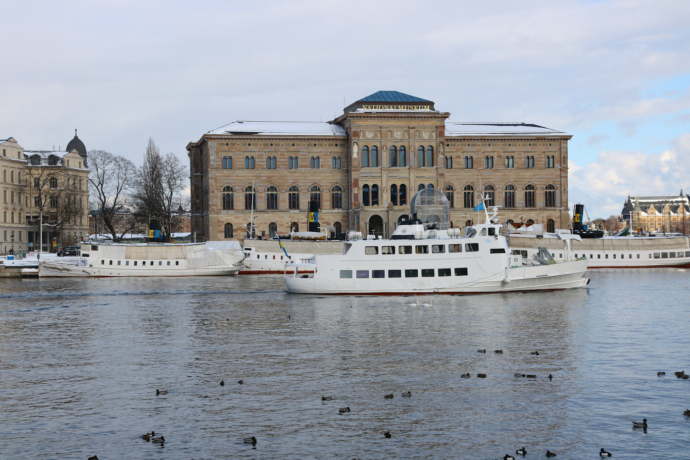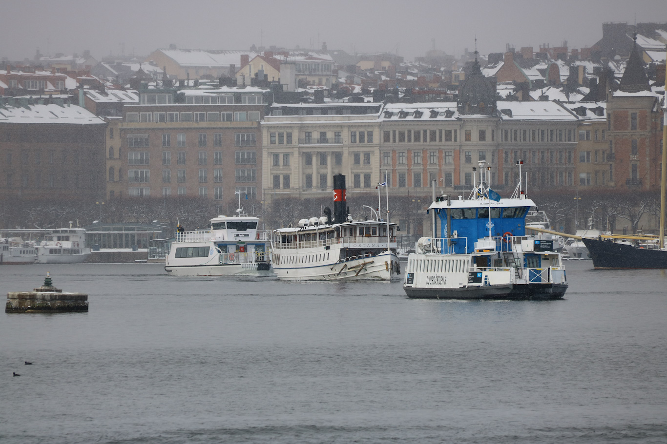 Blandning av lokal sjötrafik. Pendelbåtslinjerna 80 och 82 representeras här på bild av Clara och Djurgården 8, medan privata aktören med inriktning sjöfart och turism Strömma Kanalbolaget ståtar med den 117 år gamla Östanå I. Motorfartyg sedan många år tillbaka, men ett mycket charmig inslag på Stockholms vatten. Kör sina turer med guidning ut till Vaxholm en väldigt stor del av året., men några vilodagar i veckan vintertid. I bakgrunden syns Strandvägen med dess till storta delar pampiga hus, finns undantag, och Clara och Östanå I kommer alltså ut från Nybroviken och Ladugårdslandsviken.