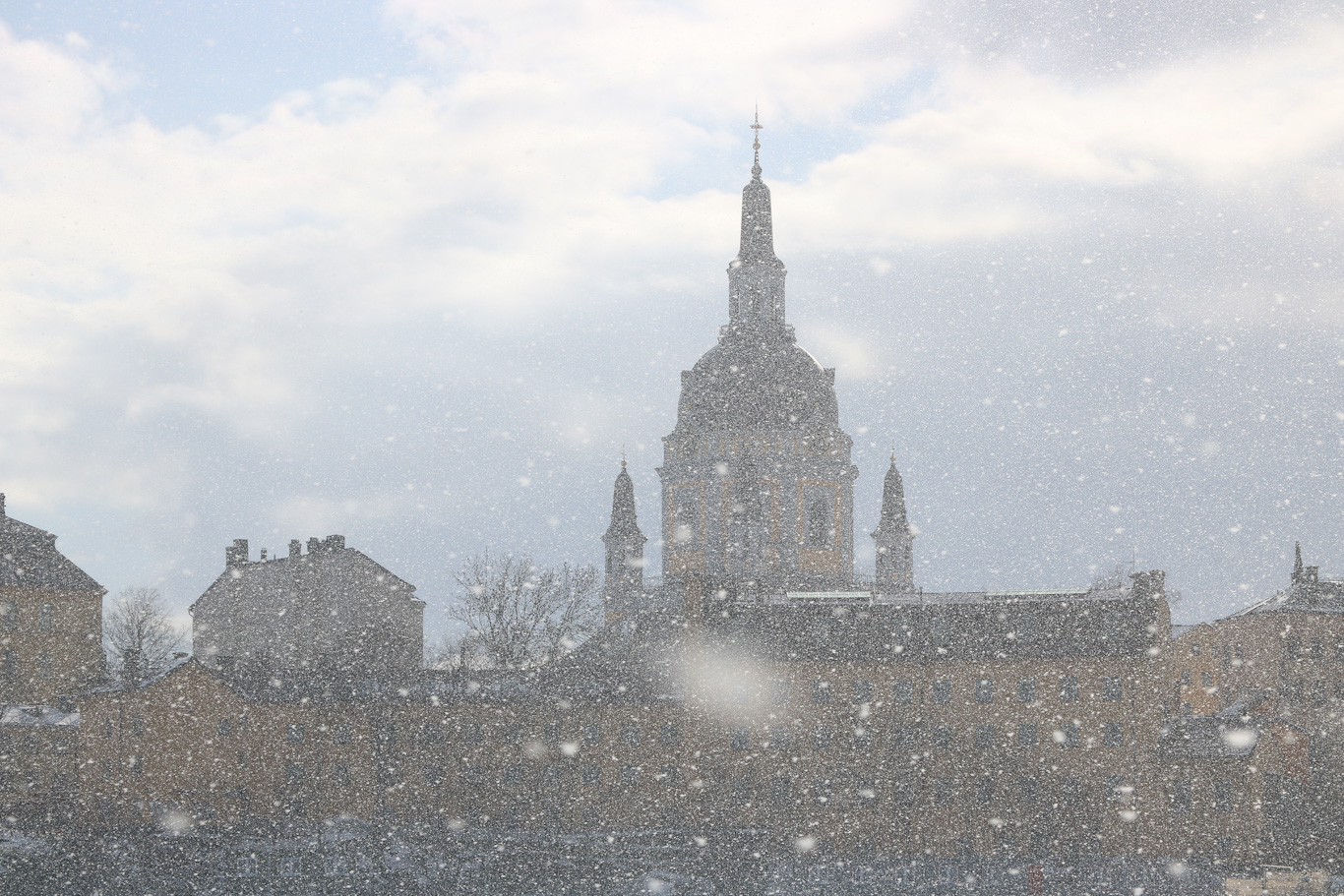 I snöyran stoltserar ändock Storkyrkans nyrenoverade torn.
