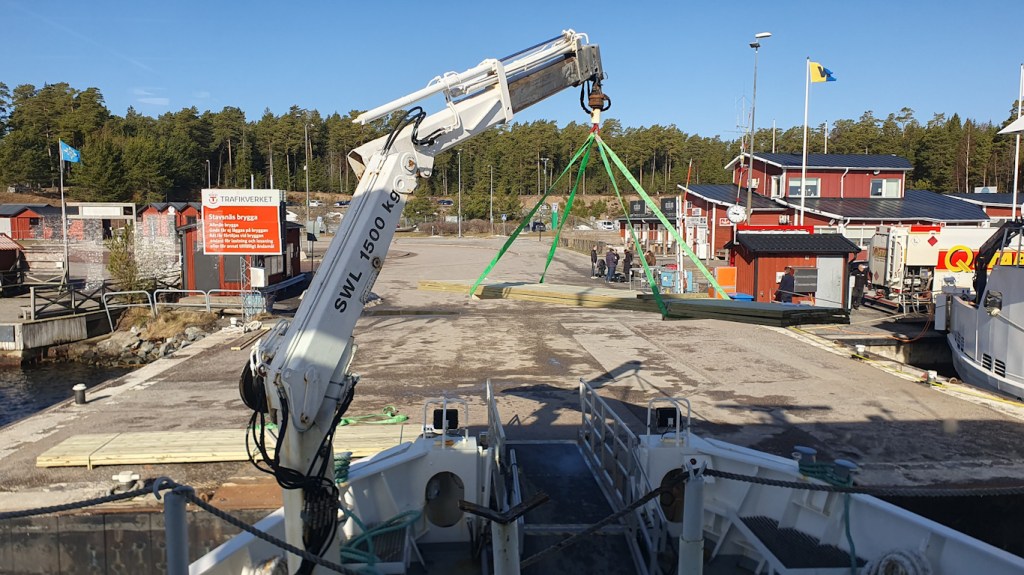 Frakt av gods av dess olika slag utgår i många fall från Stavsnäs vinterhamn, framför allt från vår till hösten när de renodlade godsfärjorna kör sin trafik. Beställning av godstransport görs via Skärgårdsgods i Albyberg, och det är Ressel Rederi som sköter denna tjänst. När inte godsfärjorna är i trafik under vintern så körs godset då på de isgående skärgårdsbåtarna, som i detta fall m/s Waxholm II som här lastar virke som skulle till Sandhamn.