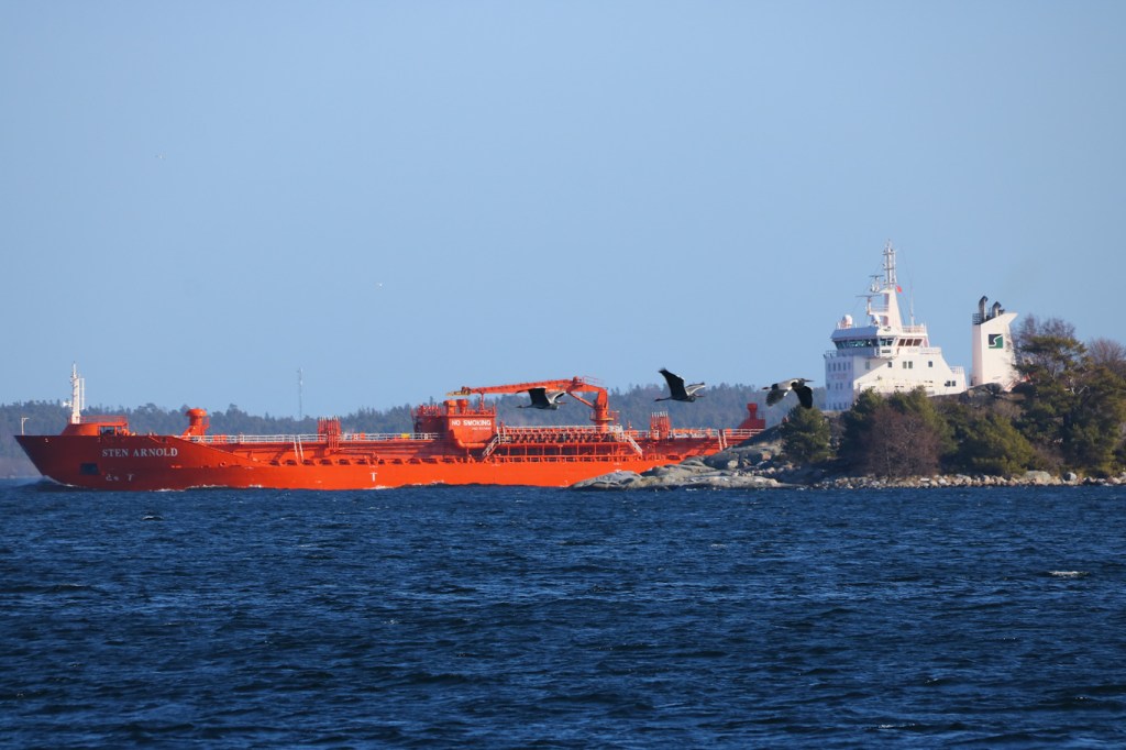 En lite festlig bild här med det ingående tankfartyget och med de tre flygande gråhägrarna. Tankfartyget Sten Arnold är på väg mot in mot Stockholm, och ska köra över Kanholmsfjärden. Kanholmsfjärden namngiven efter öarna Stora och Lilla Kanholmen belägna öster om Sollenkroka på Vindö.