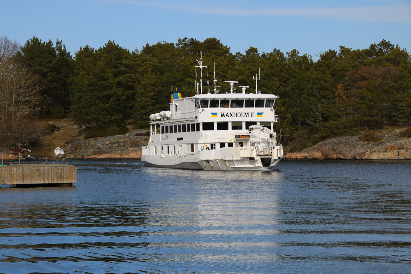 Så kom 40-åriga m/s Waxholm II tillbaka ifrån Harö och Hagede, på väg mot Stavsnäs igen. Denna Waxholm II och dess systerfartyg m/s Waxholm I byggdes i Ångermanland på Lunde varv 1983. Är inte direkt kända som några skönheter men ganska trevliga att resa med inte minst god utsikt från övre däck. Trafik till ytterskärgården brukar Waxholm II köra, men då oftast över Mysingen mellan Årsta Havsbad och Utö. Nu ersatte den m/s Dalarö som råkade illa ut i senare delen av januari då den körde på grund utanför Sandhamn.