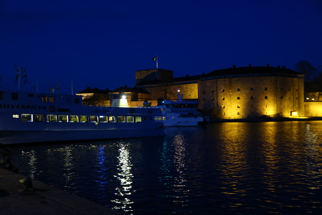 Och en intur från Vaxholm i mörkret kom jag att göra m/s Gällnö, men bara till Gåshaga brygga på Lidingö. Förutom den upplysta fästningen så syns på bilden här också m/s Silverpilen, en annan Utöbåt normalt, men som nu under någon vecka legat som övernattningsfartyg för besättningen på m/s Riddarfjärden.