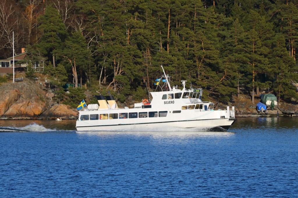 M/S Silverö lämnar Stor-Krån för att åka över Saxarfjärden till Bjurön – och sedan vidare till Vaxholm. Det här är en lokalbåt som tjänat skärgårdstrafiken i över 50 år.