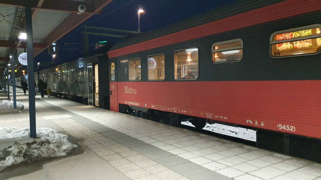 Jag åkte alltså inte med nattåget på bilden, även om så hade önskats vid detta tillfälle, med en numera sällsynt röd bistrovagn. Däremot blev mitt X2000 till Stockholm att betrakta som just ett nattåg.