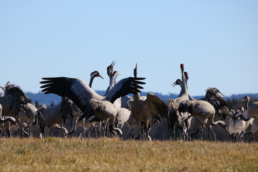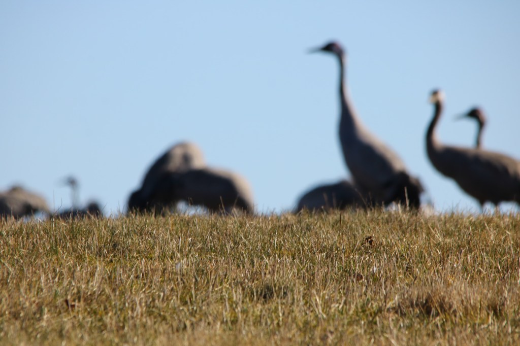 Med fokus på marken i denna bild så är ju utfordringen av tranorna i Hornborgasjön något som pågått i ett 30-tal år. Längre tillbaka i tiden fanns spritfabriker med potatisodlingar vilket skapade förutsättningar för god och födorik rastplats för tranorna. Det som tranorna numera matas med är korn som sprids ut över en avgränsad yta. Parkeringsavgiften vid Transdansen går oavkortat till tranornas föda.