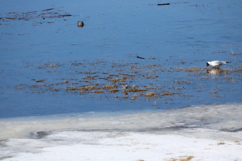 Så hördes och även syntes den karaktäristiska sädesärlan, verkligen också ett välkommet inslag mot våren. Kanske inte den roligaste av bilder när sädesärlan knappt syns, men till höger är i alla fall en skrattmås…