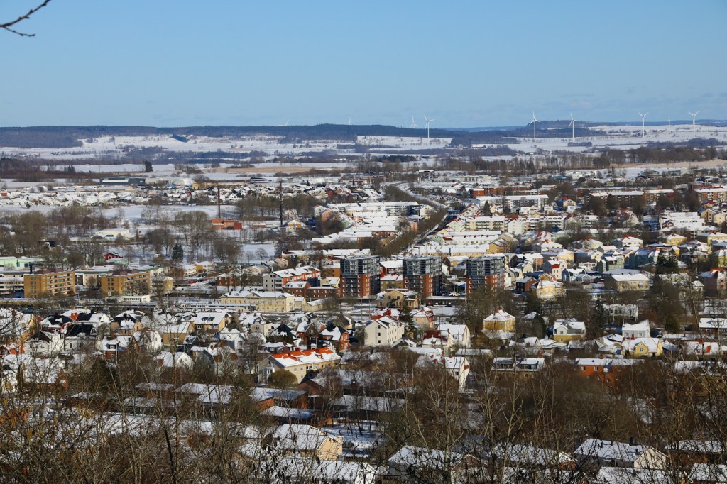 Vy mot norra delarna och bland annat Falköpings station i vänster del av bilden med hotell Ranten intill. Sedan kommer tre lite högre hus därefter, och bortom bygden utanför staden tornar vindkraftverk upp sig.