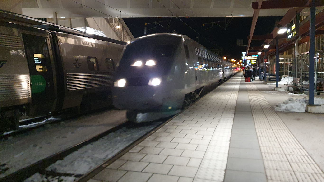 Det blev en viss förvirring om spårändring för detta tåg 450 mot Stockholm. Från spår 1 till spår 2 annonserades det ut, men när man stod vid spår 2 så kom ett tåg mot Göteborg in på det spåret. Jaha bara någon minut innan det faktum att mitt tåg äntligen kom så fick man gå över igen till spår 1. Och klockan var då närmare 22:00 när man äntligen kunde gå ombord, ungefär 30 minuter försenat. Detta blev ju dock mer efter en polisinsats vid Töreboda med tillhörande stopp och ytterligare inbromsning pga banarbete i Sörmland. Den tappre tågvärden fick fullt upp att beställa taxibilar innan ankomst Stockholm Central till klockan 01:00.