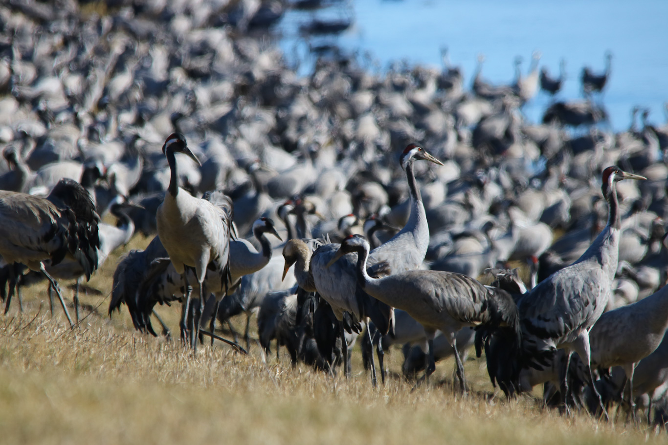Med fokus på marken i denna bild så är ju utfordringen av tranorna i Hornborgasjön något som pågått i ett 30-tal år. Längre tillbaka i tiden fanns spritfabriker med potatisodlingar vilket skapade förutsättningar för god och födorik rastplats för tranorna. Det som tranorna numera matas med är korn som sprids ut över en avgränsad yta. Parkeringsavgiften vid Transdansen går oavkortat till tranornas föda.