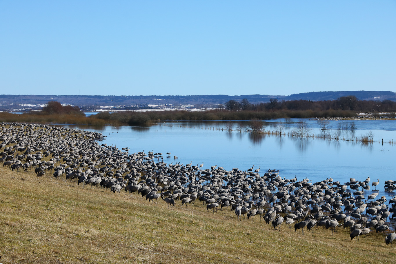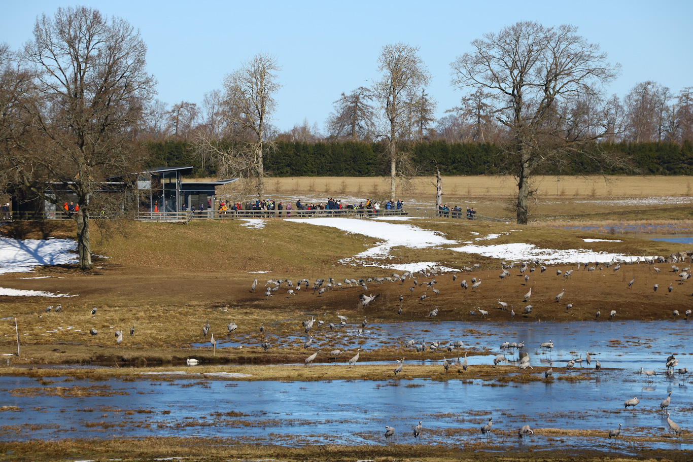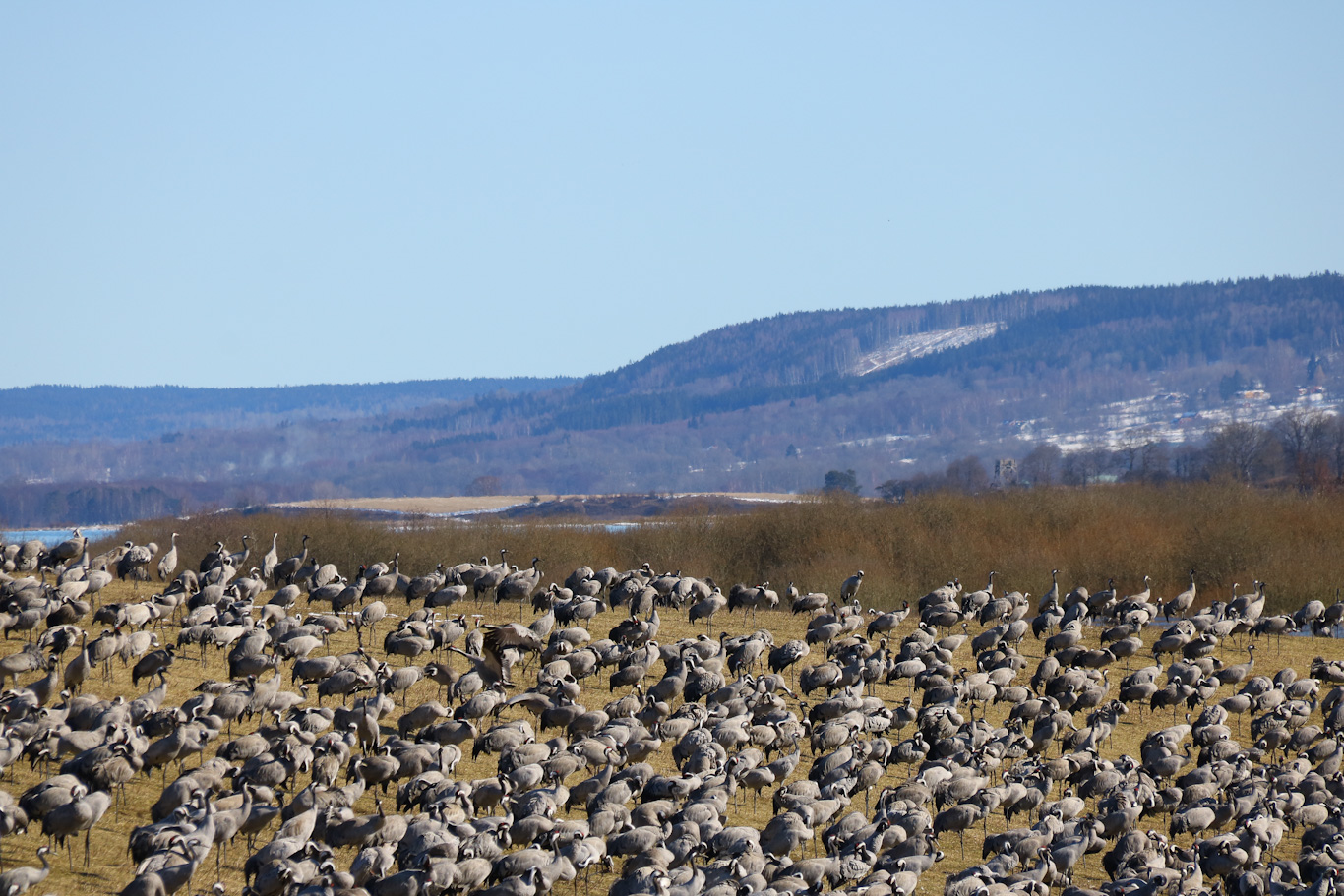 Tranorna rastar vid Hornborgasjön på sin väg mot häckningsplatserna runt om i Sverige eller övriga Skandinavien. Dagens antal räknades till 12200 tranor, när är det som flest så kan det vara ett bra antal över 20000. Dessa få veckor under våren när tranorna är på plats i dessa jättemängder så håller även ett infocenter öppet.