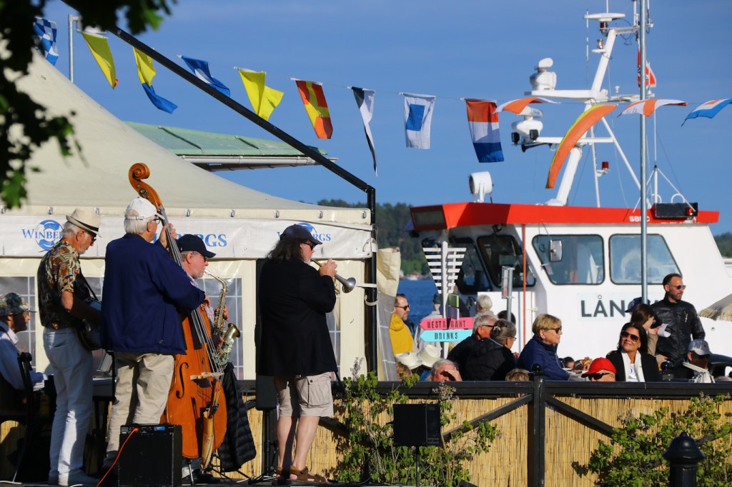 Musikunderhållning i Vaxholm genom bandet Old Boy Stompers. Även ett annat band spelade på kajen bortom väntsalen.