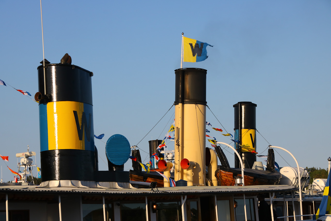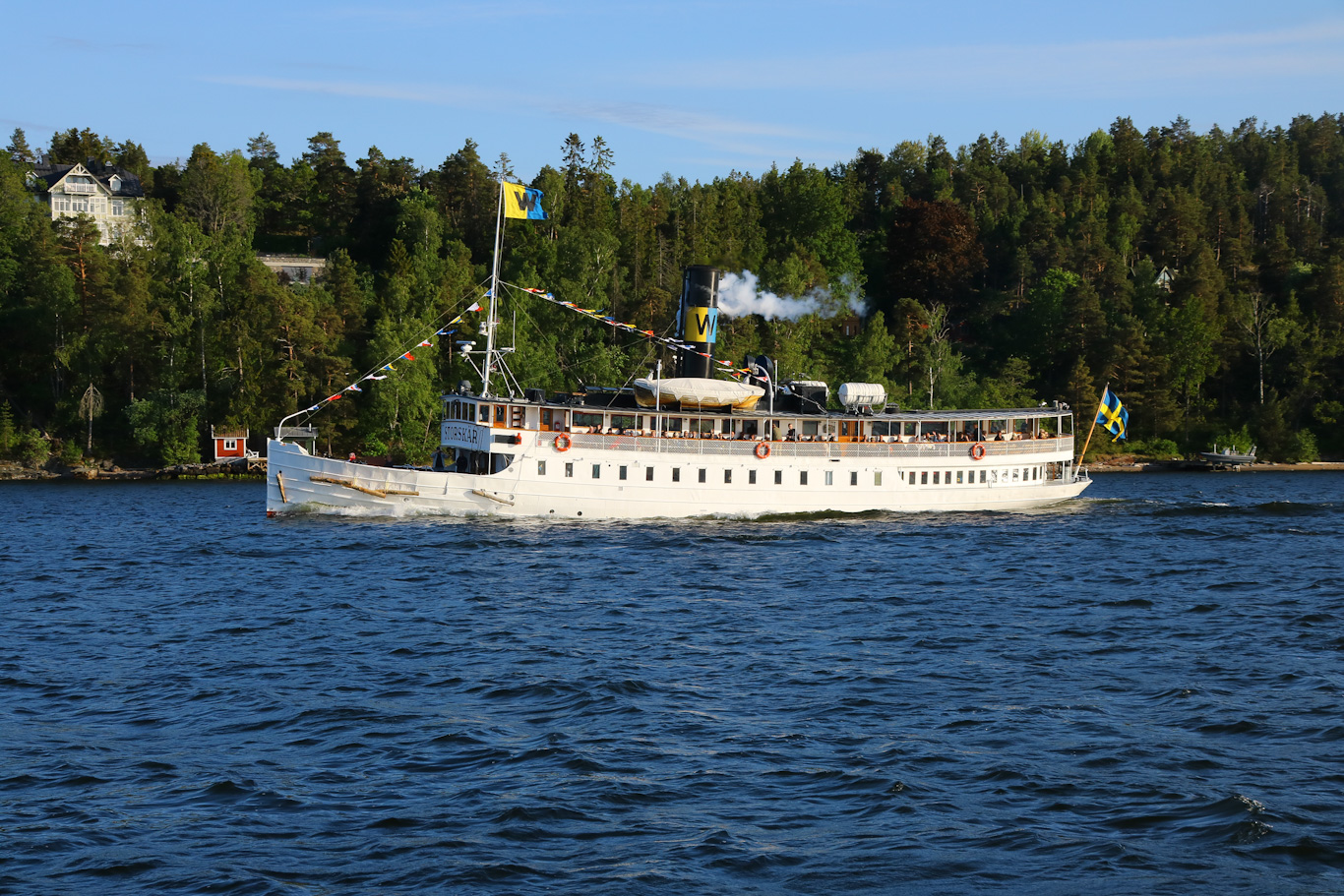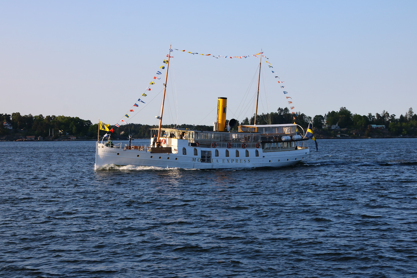 Jo s/s Motala Express möttes på sin hemresa från Idöborg vid Nämdö dit hon gått på en charter. Det här är en gammal Vätternångare, namnet påtalar ju inte minst detta, karaktären är också lite annorlunda från de ångfartyg ni sett ovan. Hög stäv för att ta Vätterns stundtals rejäla sjö, och det var på denna sjö hon var hemmahörande fram till 2010 då hon lämnade Vättern efter 115 år. För att kunna ta sig genom Göta Kanal fick man kapa stäven några meter. Upprustad till vackert skick så är numera charterturer hennes huvudsakliga trafikuppgift och hon har sin hemmakajplats vid Strandvägen. Ett mycket stiligt fartyg.