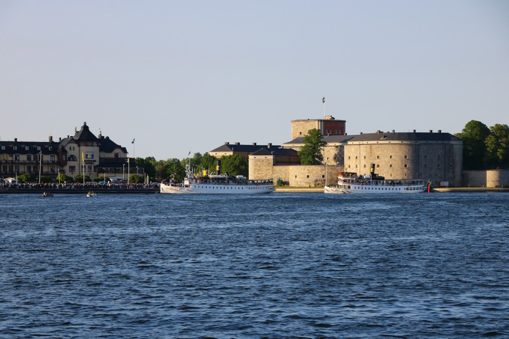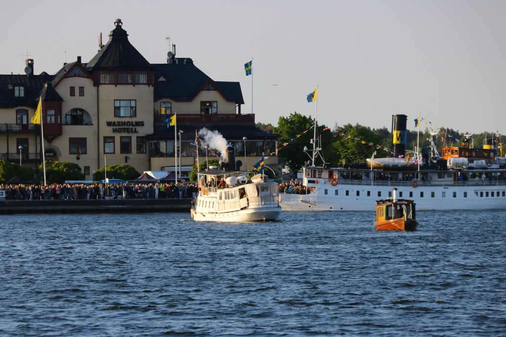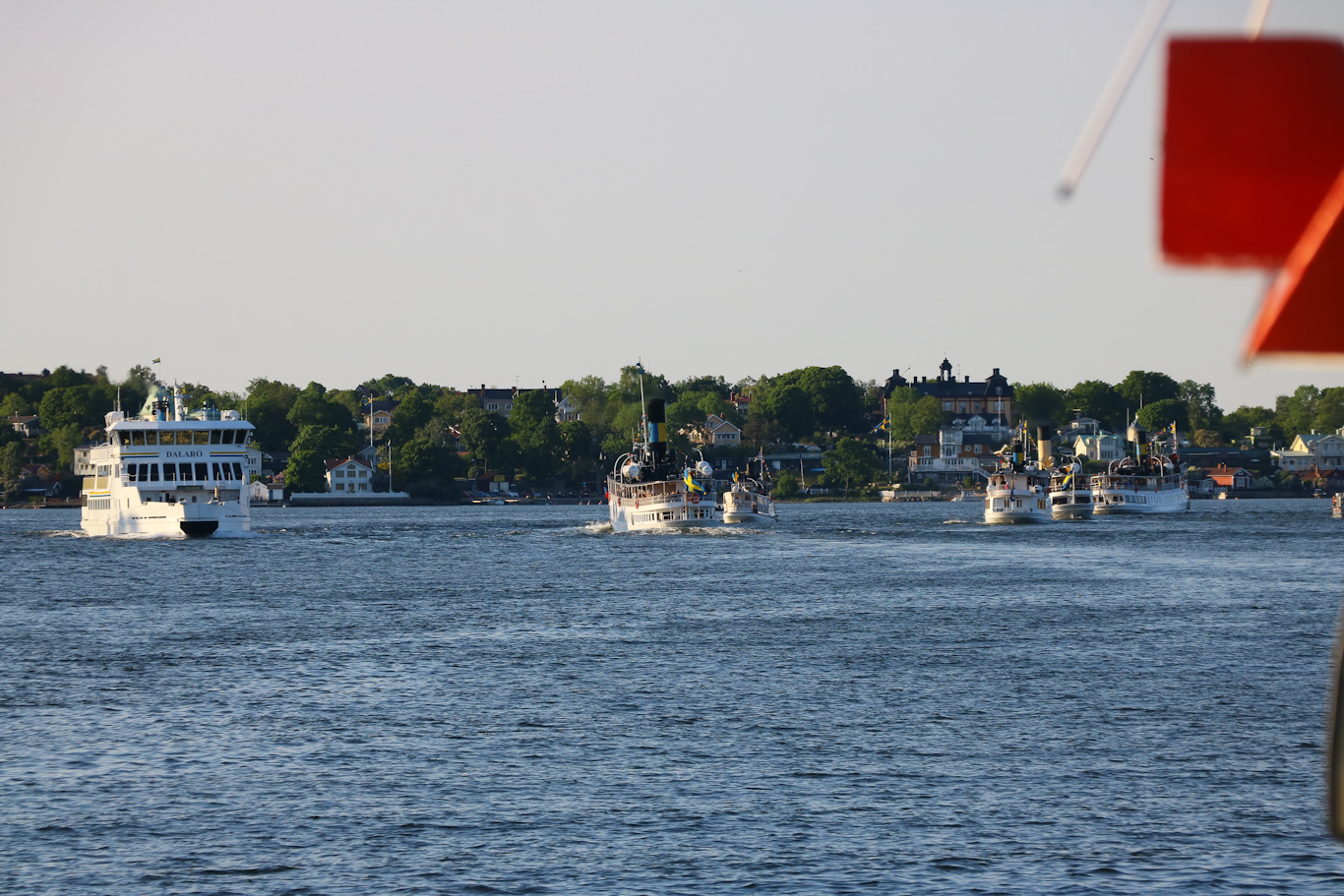 Till kl 18:00 var m/s Långvik framme i Vaxholm, därefter väntade en paus på 45 minuter innan nästa tur för att möta upp kortegen. Och då ska jag ju nämna att kortegen startar i Stockholm kl 18:15, efter först en lång och väl ljudlig avgångssignal från ångfartygen.