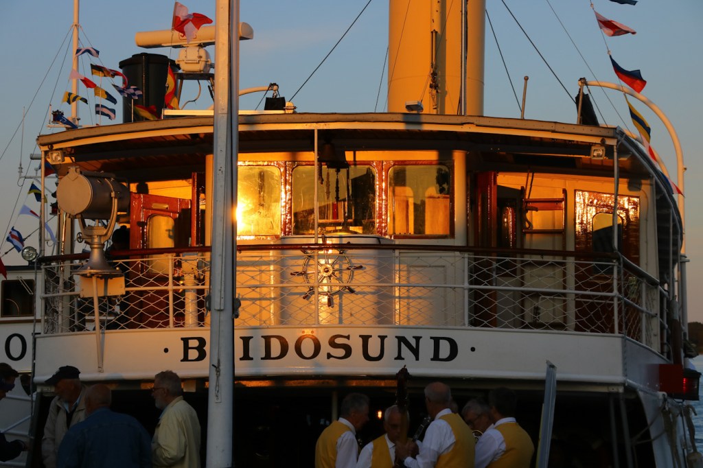 Härligt kvällsljus mot s/s Blidösund, i nederkant syns det band som brukar spela ombord på Skärgårdsbåtens dag. Kvällen i övrigt fortsatte med marknad och folktrivsel, och sedan klockan 21:00 en flaggceremoni vid Söderhamnsplan.