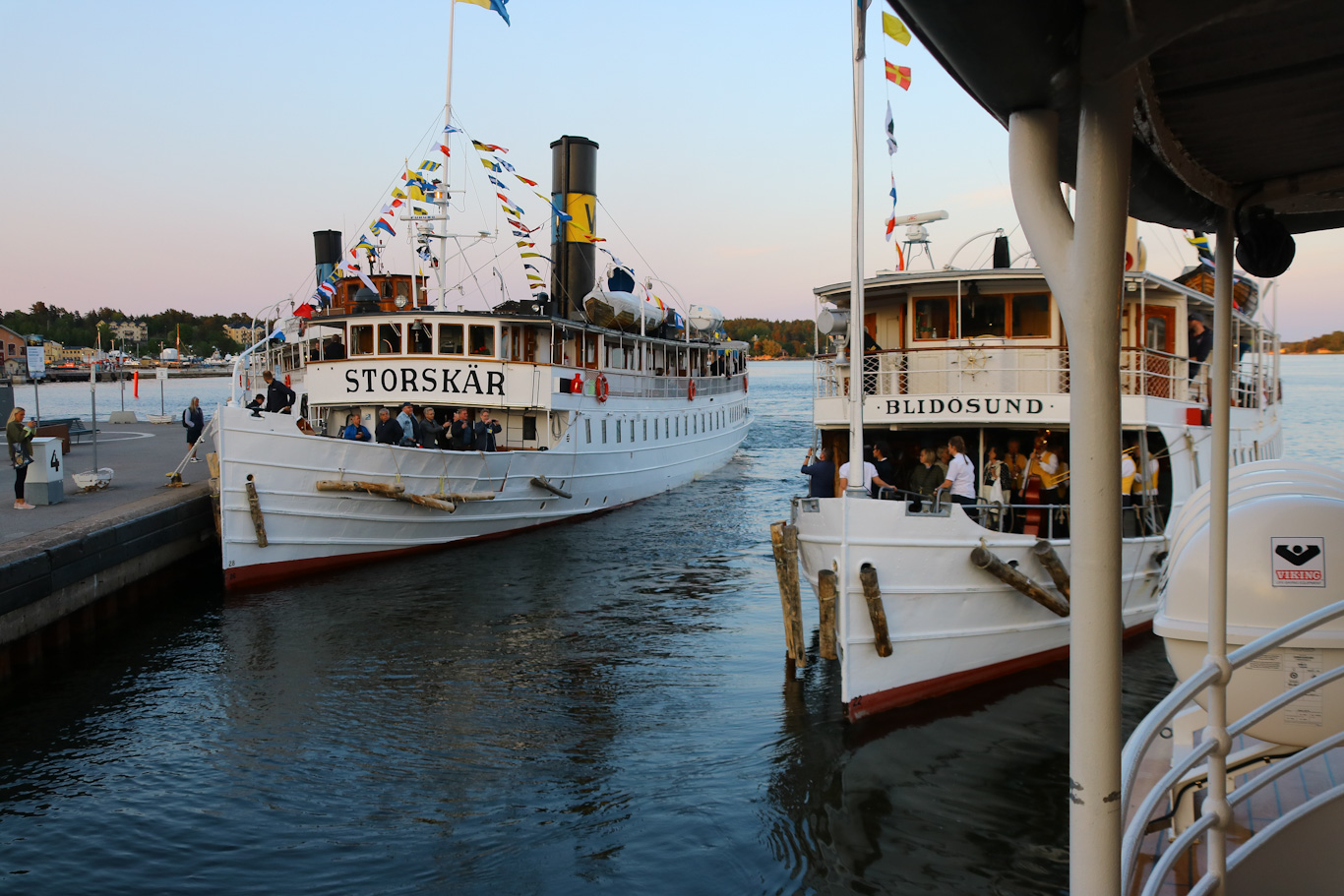Först i kortegen kom ångfartyget Storskär. Byggd 1908 på Lindholmens varv i Göteborg som Strängnäs Express och trafikerade sina första 30 år i Mälaren, just mellan Stockholm och Strängnäs. Blev ”Waxholmsbåt” i december 1939 och fick kort därefter namnet Storskär. Storskär är en av två av Waxholmsbolaget kvarvarande ångfartyg och hon kör dagligen från första delen av maj till mitten av september. Är ju en snabbångare god för 13 knop och drygt det vid gynsamma förhållanden. Ett par turer som kan rekommenderas med detta ångfartyg är lördagar till Ramsmora på Möja och söndagar till Husarö. Men hon går även en klassisk tur från Stockholm till Ljusterö vardagseftermiddagar – den så kallade ”kvart i femman” då avgångstiden sedan 1970-talet varit just 16:45.