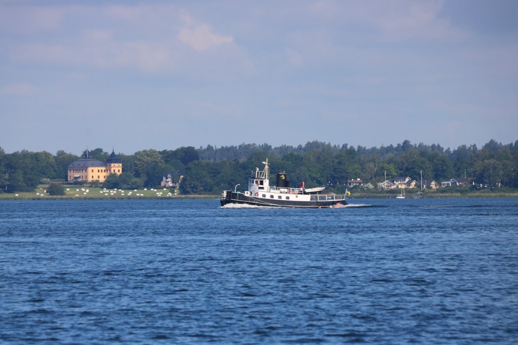 M/S Korsön på ingående på Trälhavet. Ägs av Antrophia Rederi som också driver Siaröfortet på Kyrkogårdsön intill Furusundsleden. I bakgrunden Margaretelunds slott i Åkersberga.
