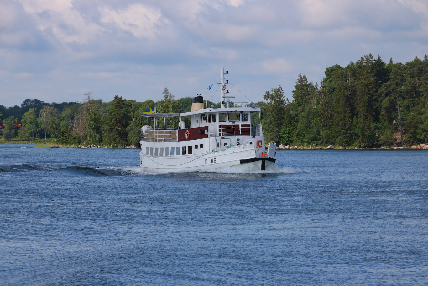 Fredagen 7 juli åkte jag med m/s Rex, ombyggd sedan några år till elhybriddrift, på pendelbåtslinjen från Ekerö till Klara Mälarstrand i Stockholm. Två veckor i början och två början i slutet av sommarturlistan på denna SL-linje 89 så kör hon komplettering till m/s Lux, ordinarie fartyg. De andra veckorna är hon uppe i Roslagen och gör turer för Norrtälje kommun mellan just Norrtälje och öarna Lidö och Arholma.