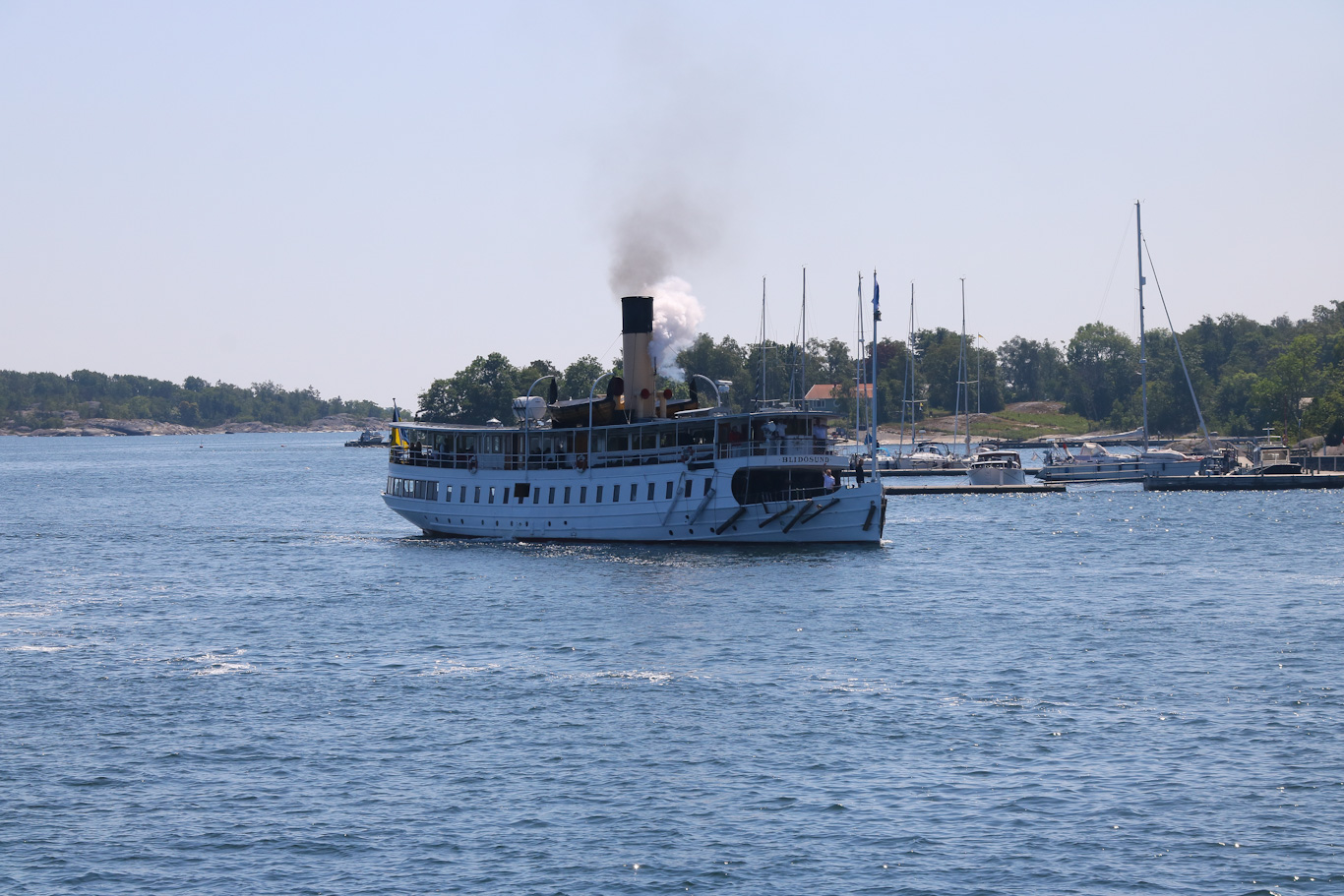 Vid Fejan skulle ett par resenärer plus en besättningsman byta till s/s Blidösund för dess utskärgårdstur som denna vackra lördag gick till Stockholmen och Håkanskär skärgård. Jag åkte med den första utskärgårdsturen denna säsong som gick 17 juni till Sundskär, då var vi blott 12 resenärer ombord.