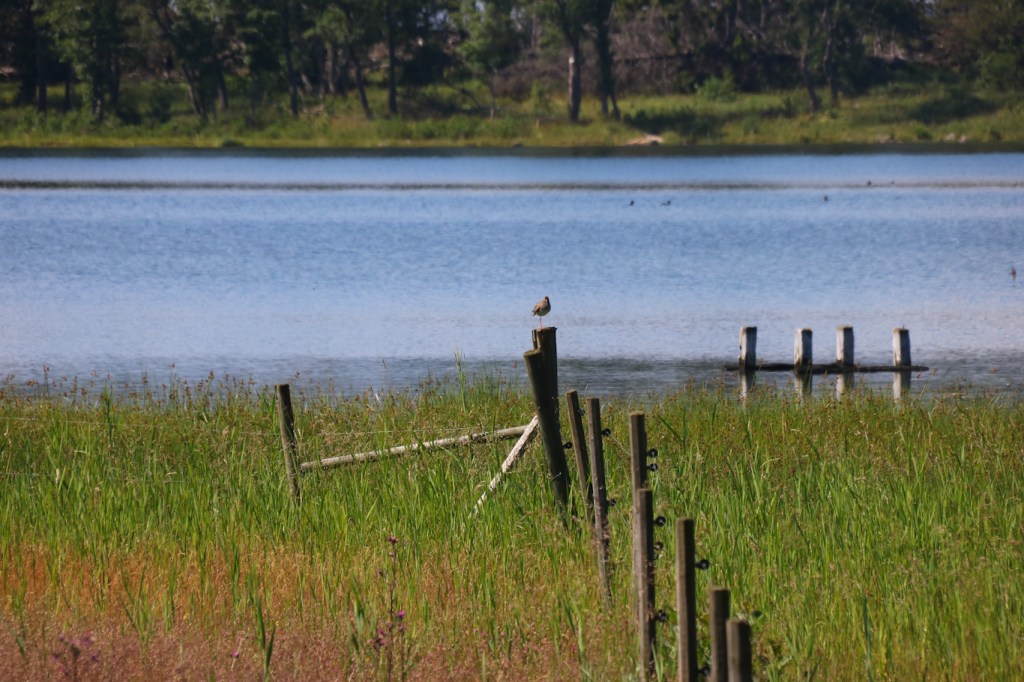 Från bryggan är det inte särskilt lång promenad till byn, man följer en skylt mot Idö gård längs en lummig stig. Och nedanför byn ligger alltså Idöfladen där det var rikt på fåglar – bland annat denna rödbena på bilden, en vadarfågel.