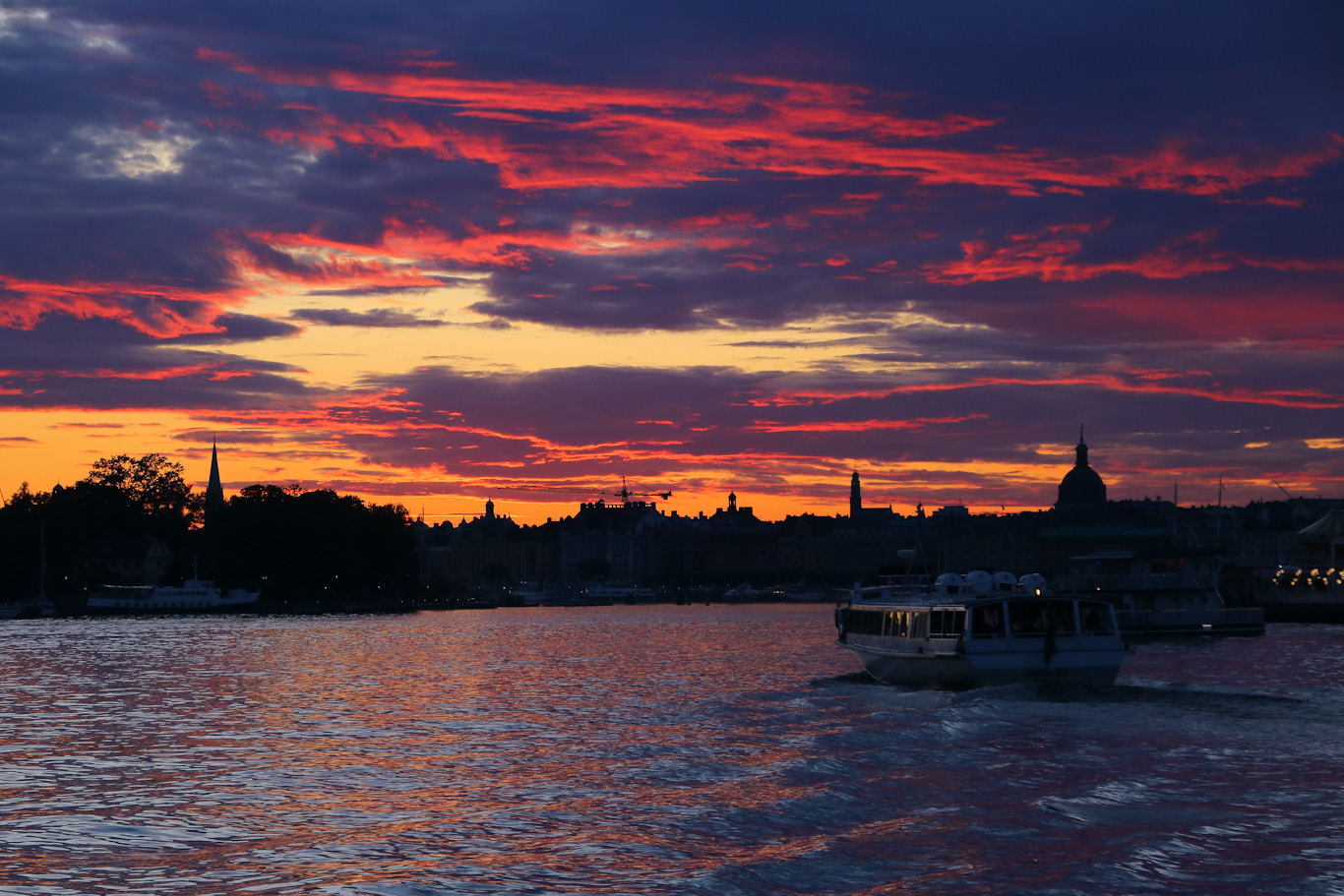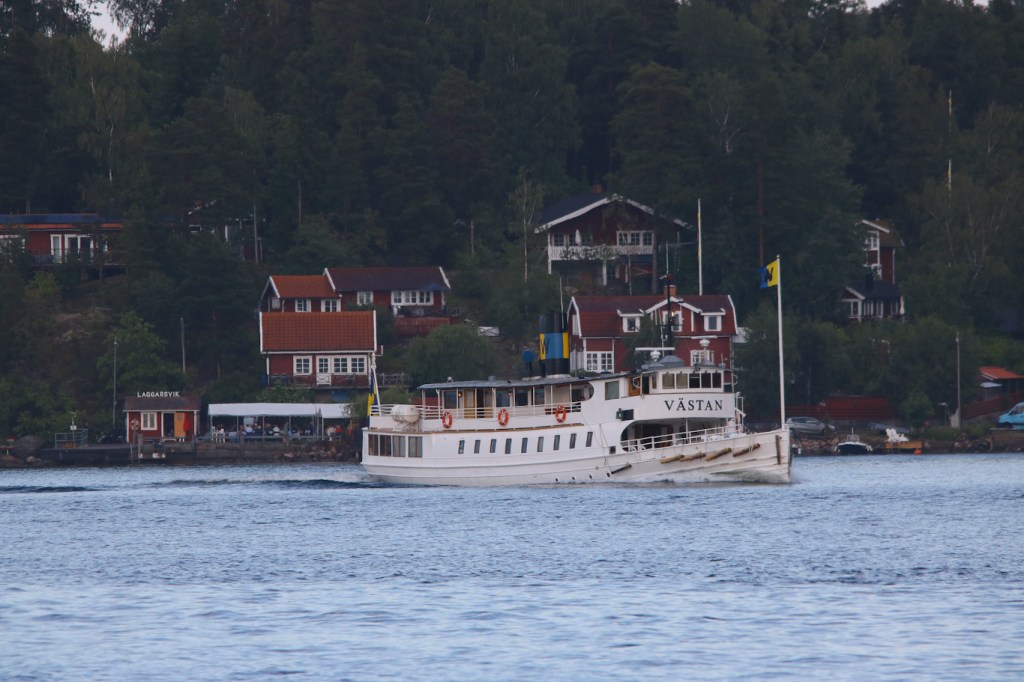 Åh vilken härlig syn utanför Laggarsvik på Ljusterö. M/S Västan på väg från Väsbystrand till Stockholm. En lördag i augusti brukar jag göra denna härliga kvällstur med Västan, med ca 40 minuters uppehåll vid Väsbystrand, avgång 15:30 från Strömkajen i Stockholm. Då i augusti brukar också en och annan kräftskiva synas vid någon av öarna längs vägen.