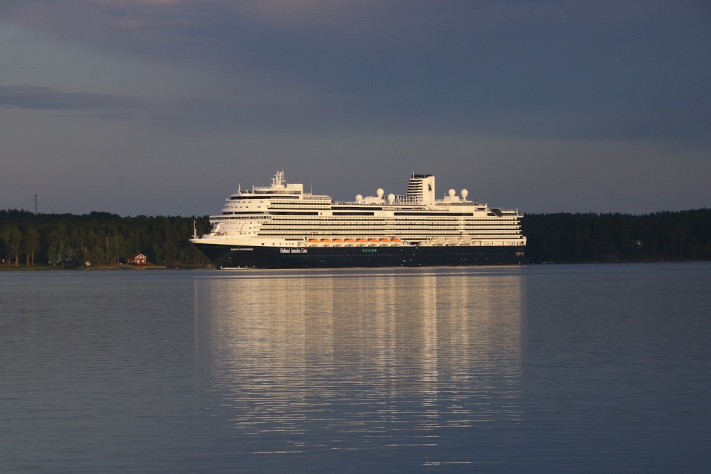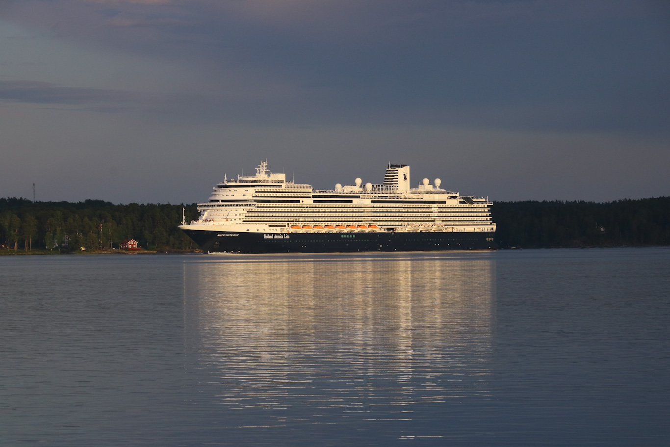 Och på en kvällstur bort mot Rindö hamn med m/s Skarpö skådades kryssningsfartyget Nieuw Statendam på väg in mot Oxdjupet och sedan mot vidare destinationer. Ett bländande ljus fick man när hon kom på Sandöfjärden.