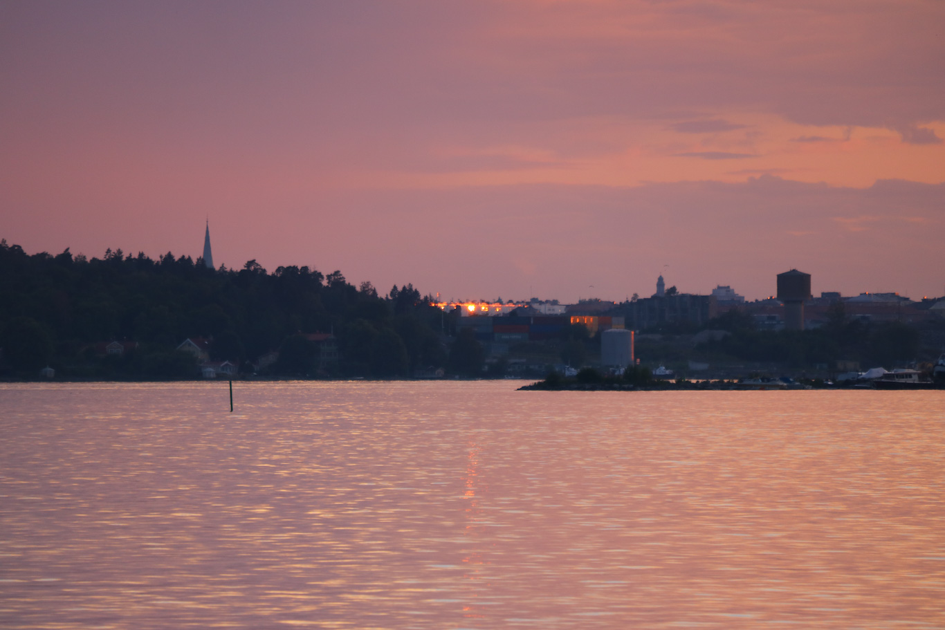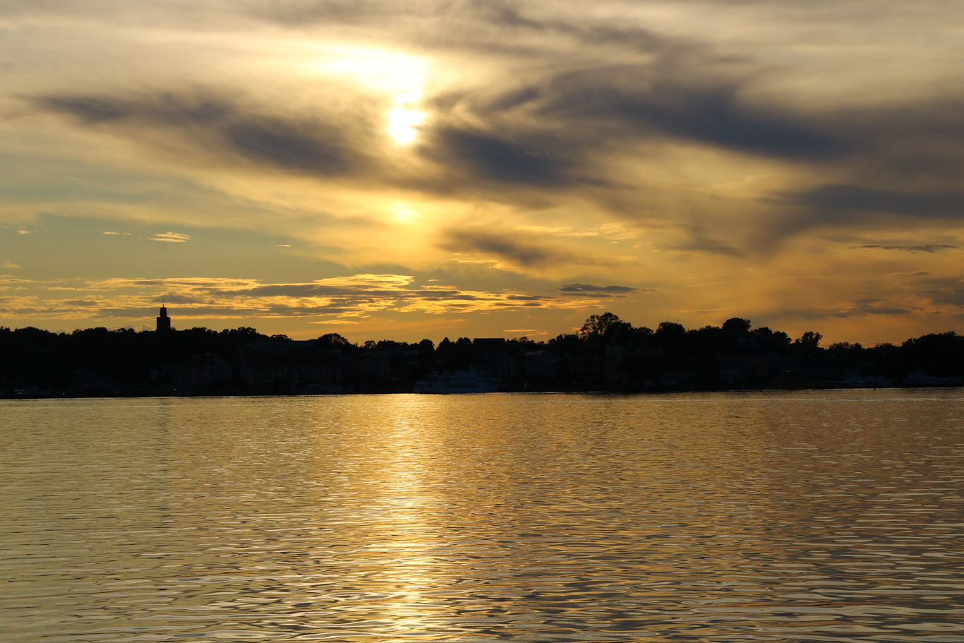 Vaxholm i guldglänsande ljus. Just ljuset var något som karaktäriserade hela kvällsturen in till Stockholm. I Vaxholm kom dessutom en annan vän ombord.