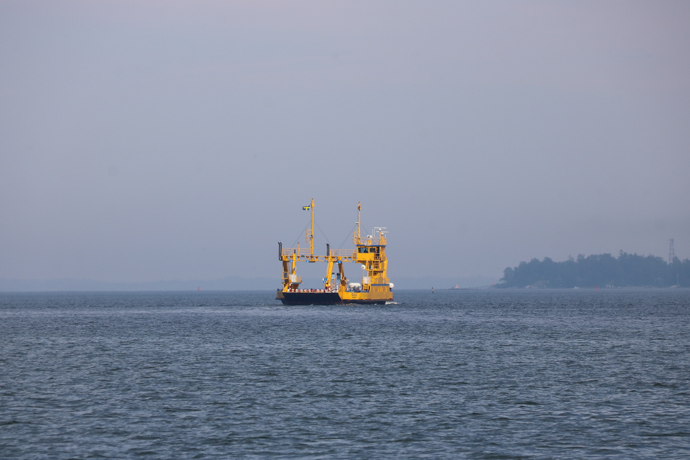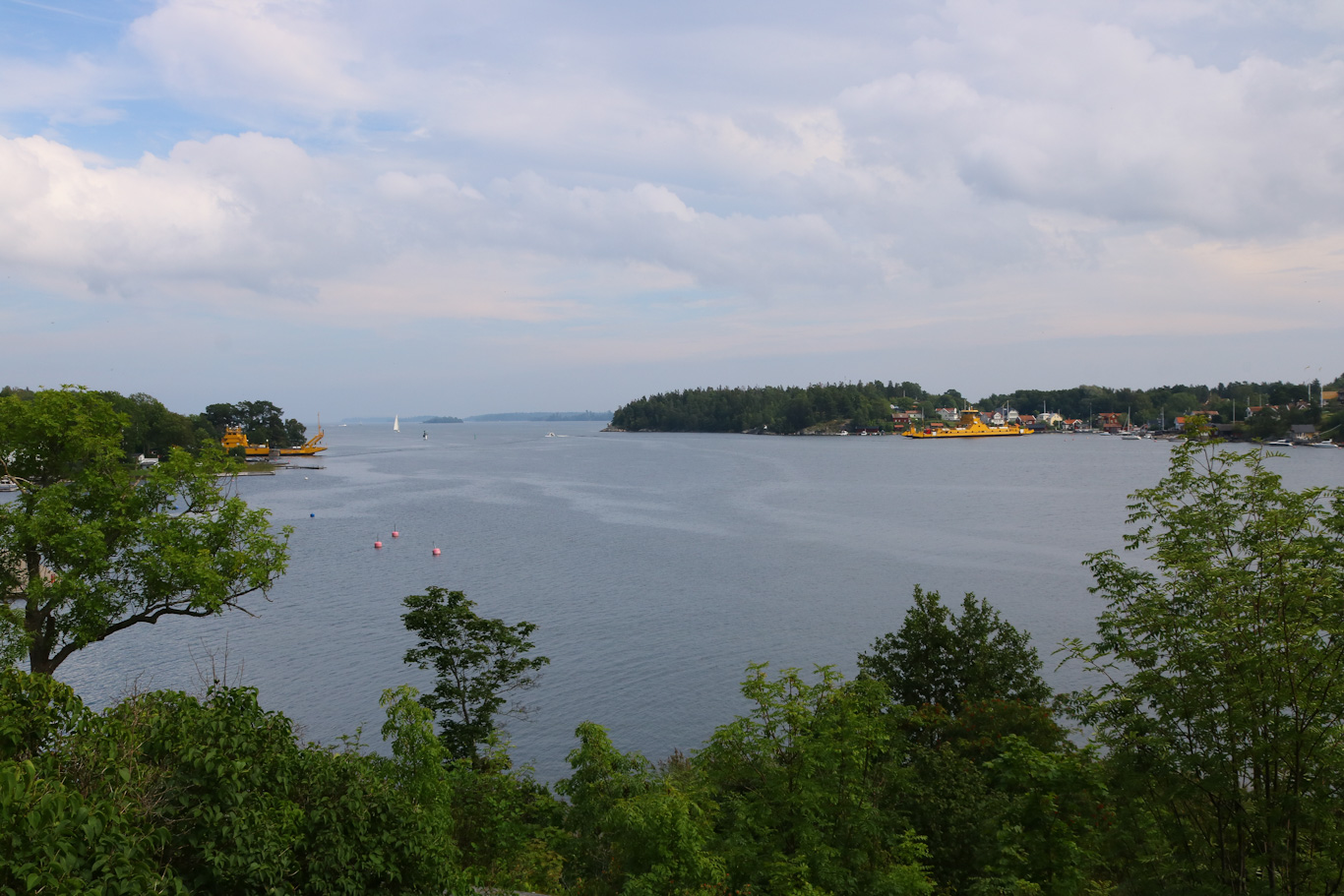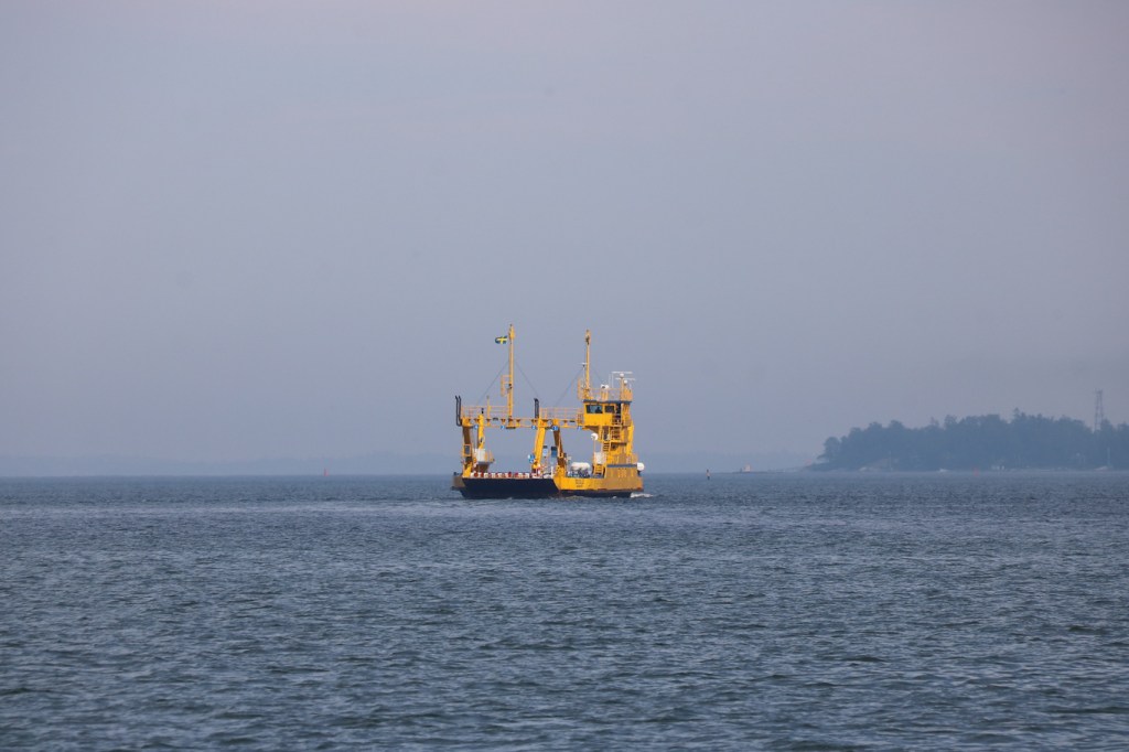 Vägfärjan Gulli lite ur kurs från leden mellan Furusund och Yxlan, men hon skulle också upp till Gräsöleden som går mellan Öregrund och Gräsö. Längre upp i Roslagen alltså, och på tal om längre upp så syns ett torn till högerkant av bilden och det är ett riktmärke för Marö.