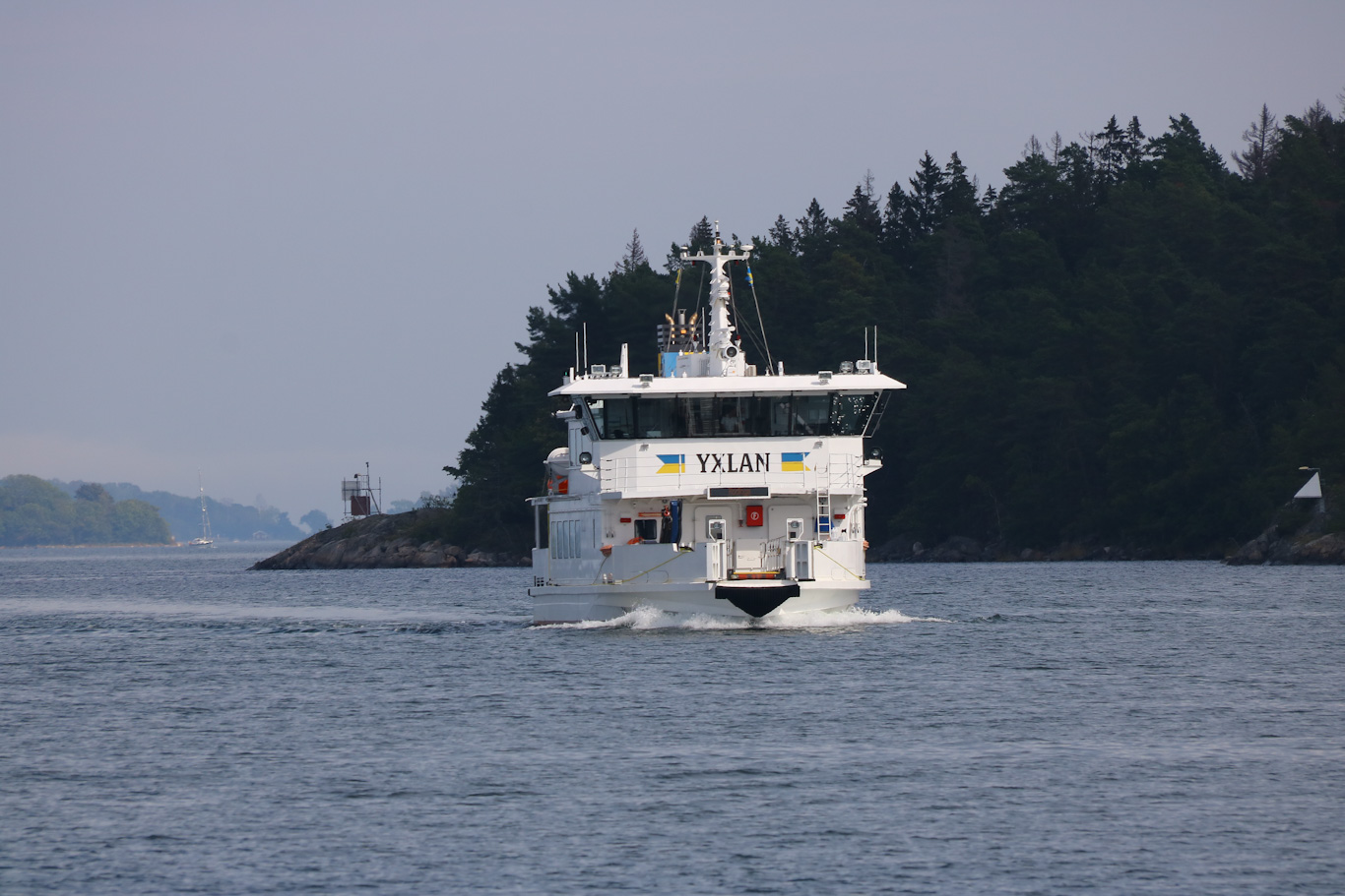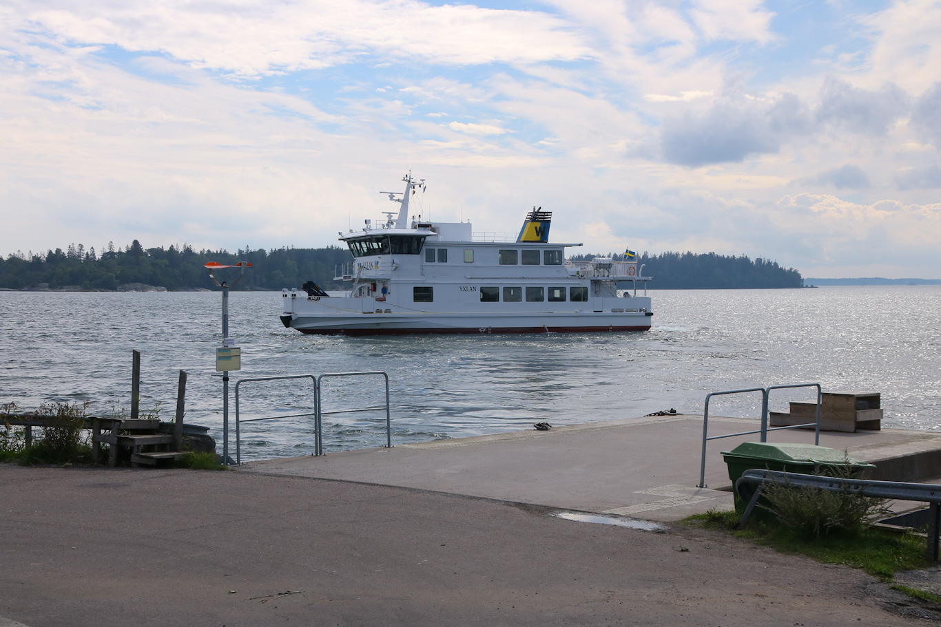 För att ta mig till Marö ifrån Furusund så valde jag varianten att åka med m/s Yxlan först till Östernäs. Avgångstid klockan 14:00 och här kom hon in från en av sina turer utåt havsbandet med öarna Norrröra och Söderöra bland annat. Vissa turer sträcker sig till Svartlöga och Rödlöga.