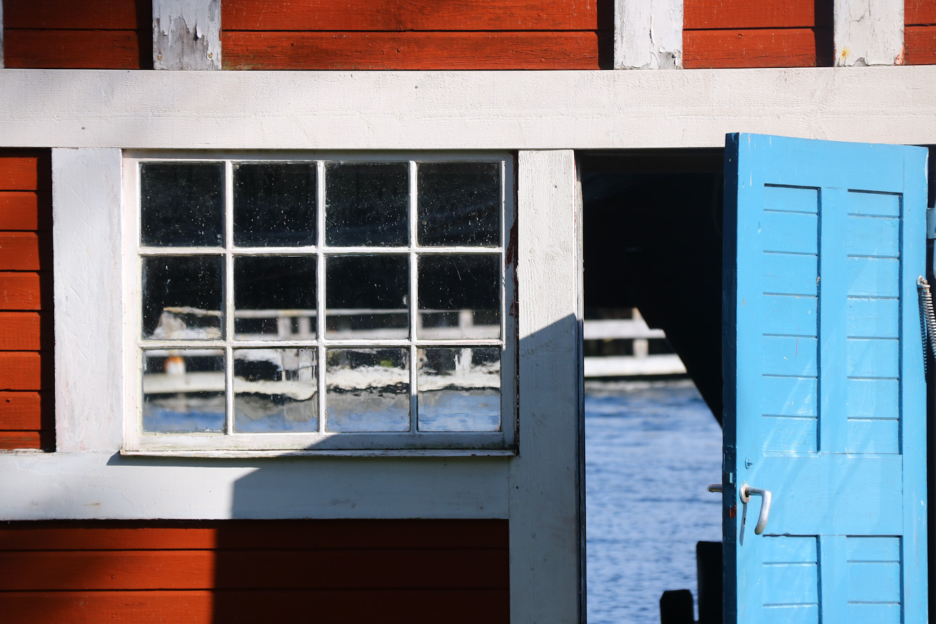 Blå dörr med siktet inåt mot blått vatten.