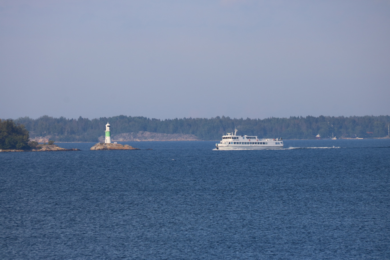 Från Arholma kommer m/s Sjöbris på väg utanför fyren Kapellskär. Och var ligger den fyren om inte precis utanför just Kapellskär på Rådmansölandet där en ångbåtsbrygga finns förutom den stora färjehamnen – och till ångbåtsbryggan i Kapellskär är m/s Sjöbris på väg.