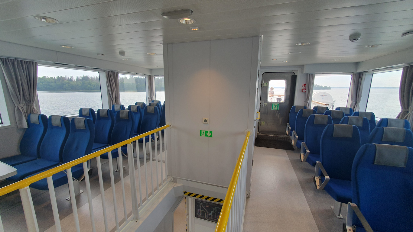 Till skillnad från den långsamgående stålbåten m/s Yxlan så är lättmetallbåten m/s Skraken en kvickare båt god för dryga 25 knop även ekonomifart är lägre än så förstås. Invändigt är det komprimerat med stolsrader, benutrymmen är inte de bästa…