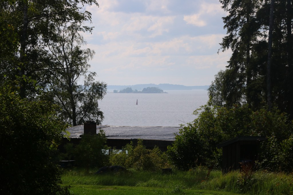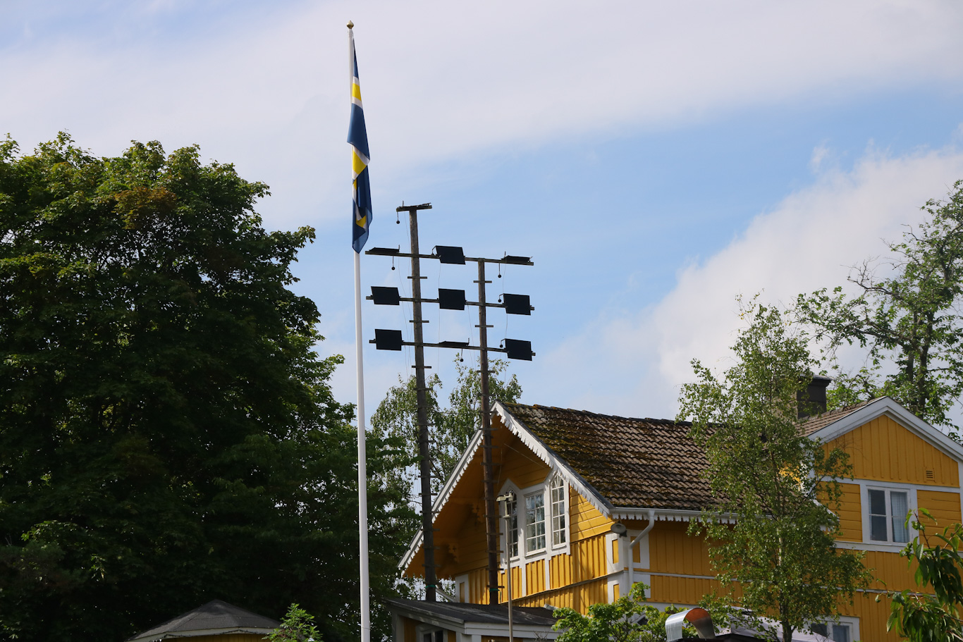 Gick några meter längs Strindbergs väg, som även skulle kunna kallas Astrid Lindgrens väg ty hon hade en fastighet vid sjön längs denna byväg. Denna optiska telegraf kunde man också skåda. Flaggan som ser ut som den svenska men med vita inslag – det är den inofficiella Roslagsflaggan som tillkom för bara några år sedan.