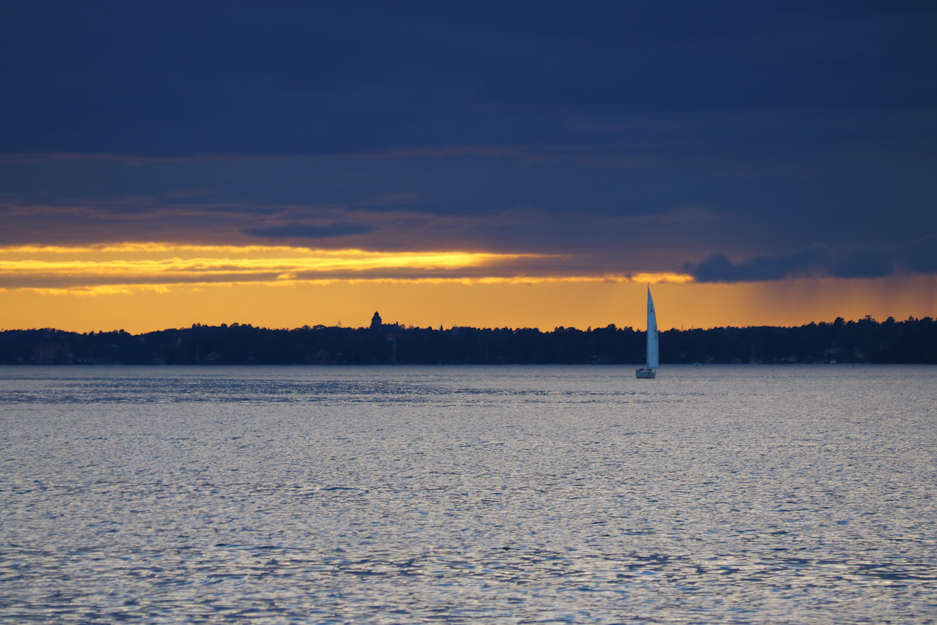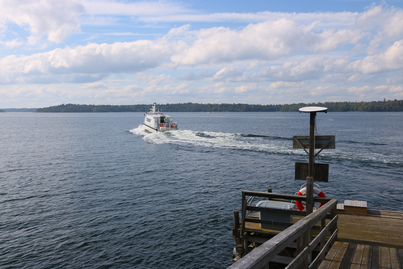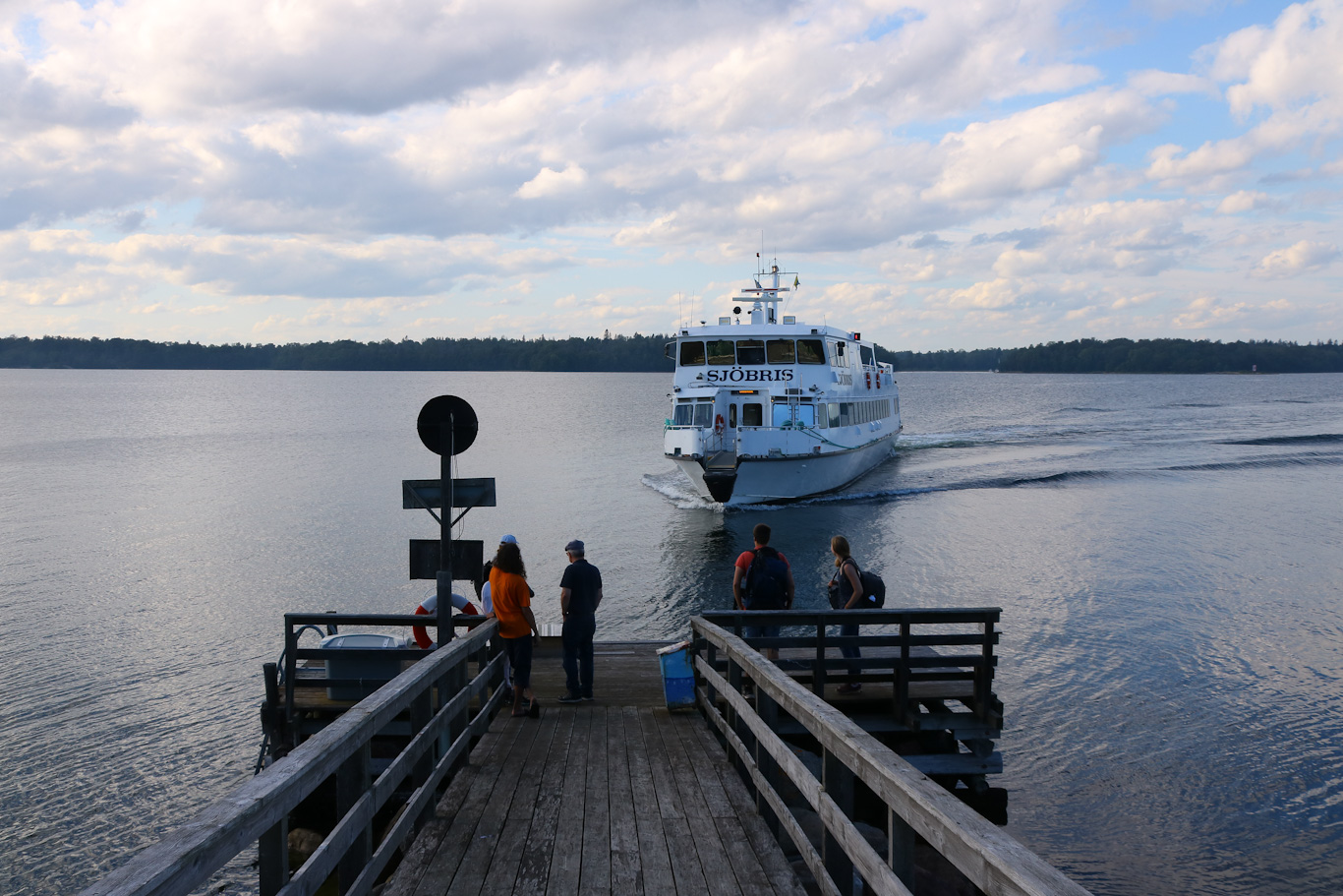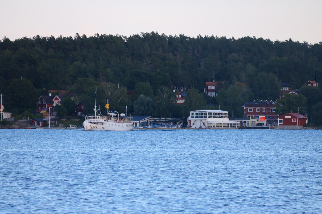 Längs färden mot Stockholm passerades västra delen av stora Ljusterö. På bilden Linanäs där ångfartyget Storskär varit inne på sin kvällstur upp till en annan brygga på Ljusterö – Väsbystrand. Vid Linanäs finns bland annat båtmack, restaurang och så en busshållplats för linje 626 mot Åkersberga/Danderyds sjukhus. Vägförbindelse med fastlandet finns längre norrut på ön med färjeleden över till Östanå.