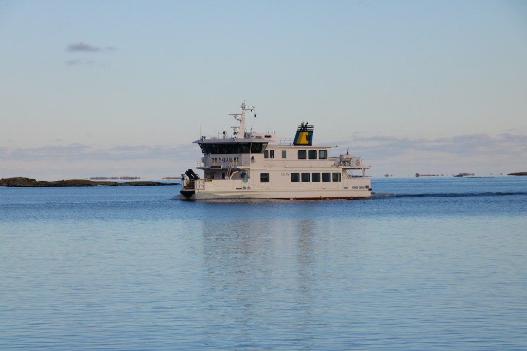 M/S Yxlan fick invänta att Sjögull passerat innan hon kunde ta den prickade farleden in mot Svartlöga brygga. Det är grunda farvatten här ute.
