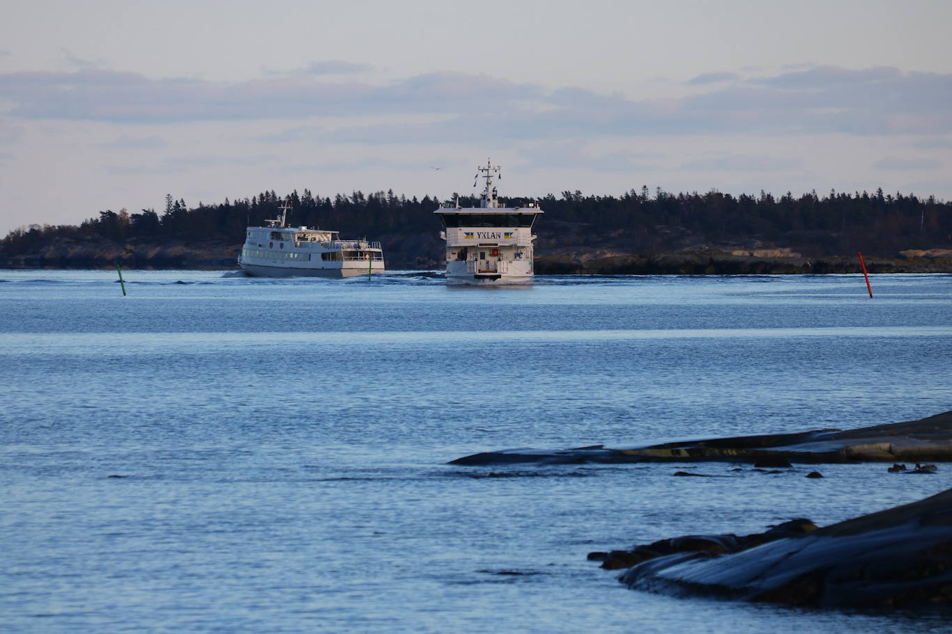 M/S Yxlan fick invänta att Sjögull passerat innan hon kunde ta den prickade farleden in mot Svartlöga brygga. Det är grunda farvatten här ute.
