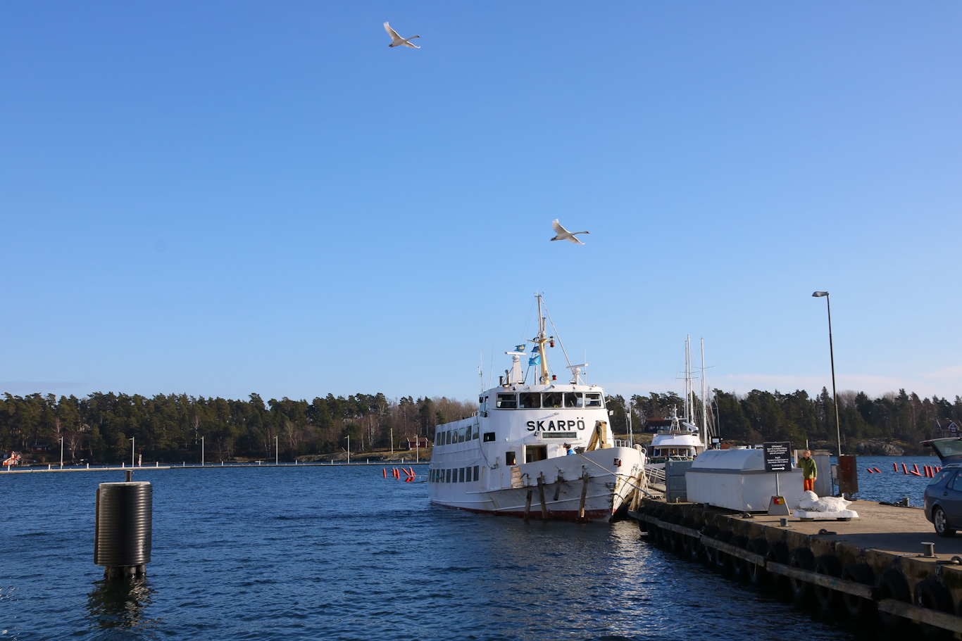Svanar flög förbi nere i hamnen nära pendeltågsstationen Nynäshamn. Som sagt, bara ca 100 meter från station ner till bryggan eller pontonen där m/s Skarpö låg förtöjd inför resan över södra Mysingen mot Ålö med avgång kl 13:20.