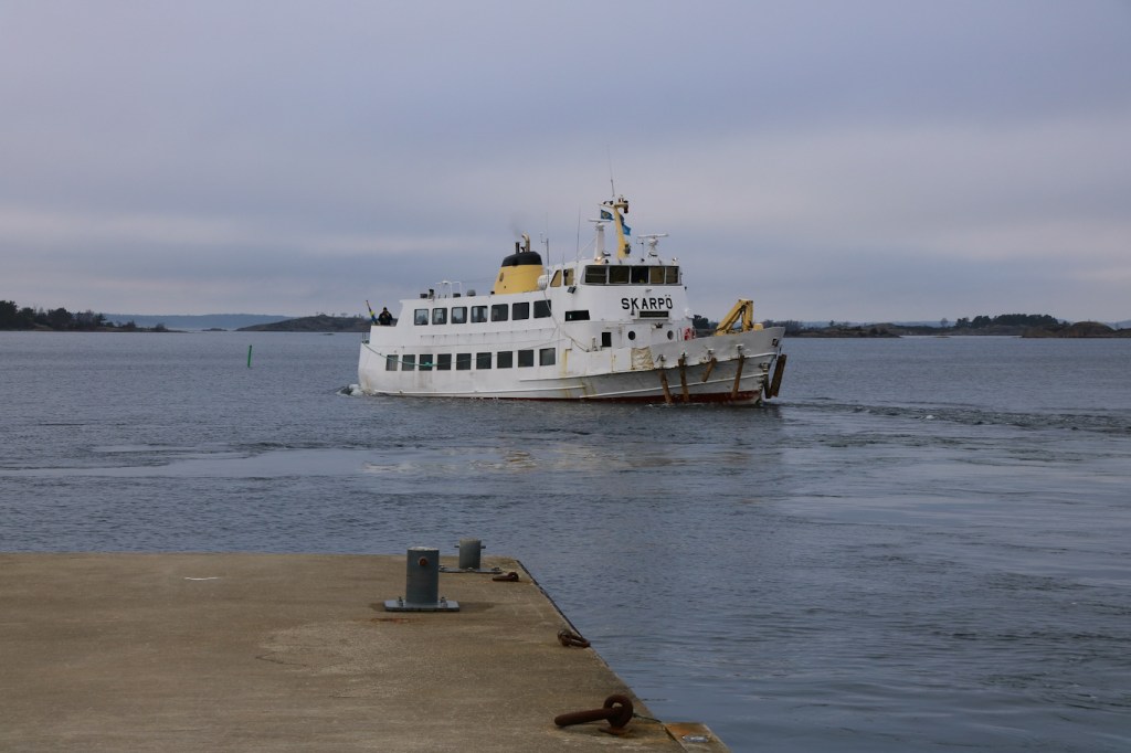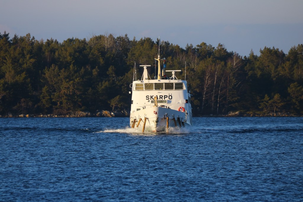 En dryg halvtimmes överfart från Nynäshamn till Nåttarö där jag debarkerade m/s Skarpö. Denna klassiska skärgårdsbåt byggd 1965 som tredje fartyget i en serie som brukar kallas ”Ö-båtarna”. Systerfartygen heter Ramsö och Tynningö – och fartygens namn kommer av öar precis utanför Vaxholm. Den först byggda Tynningö såldes från Waxholmsbolaget år 2007 till att bli bostadsfartyg så hon är numera ej användbar i skärgårdstrafiken.