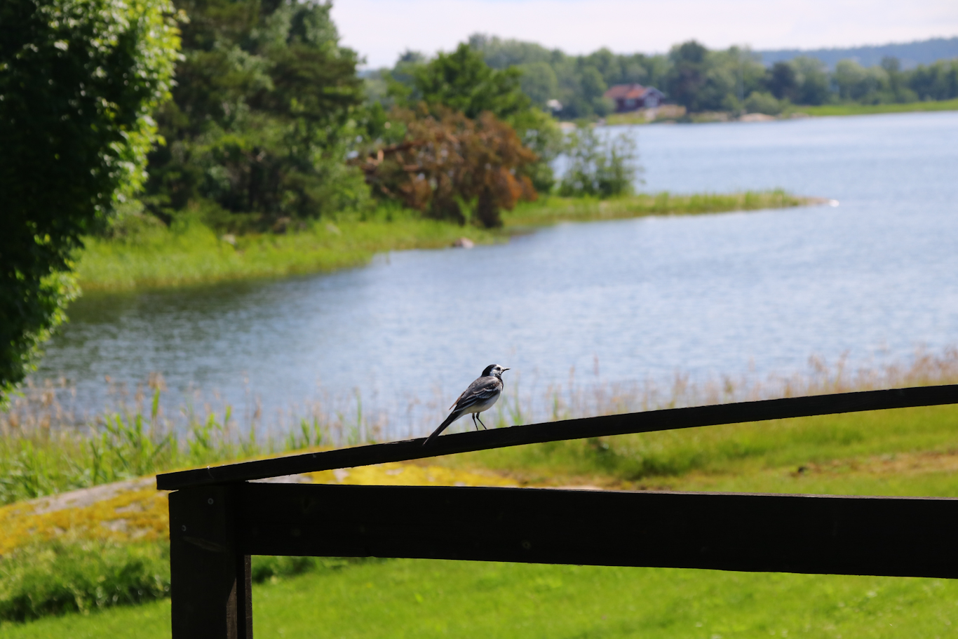 Sädesärla på grind till tillsynsmännens plats i torpmiljön nära bryggan.