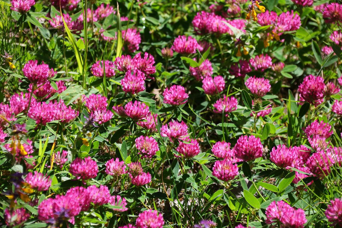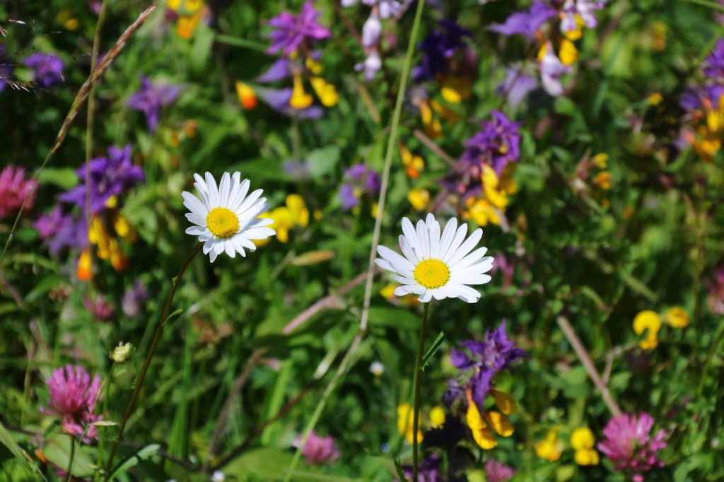 Prästkragar, lundkovall (Natt och dag) och rödklöver.